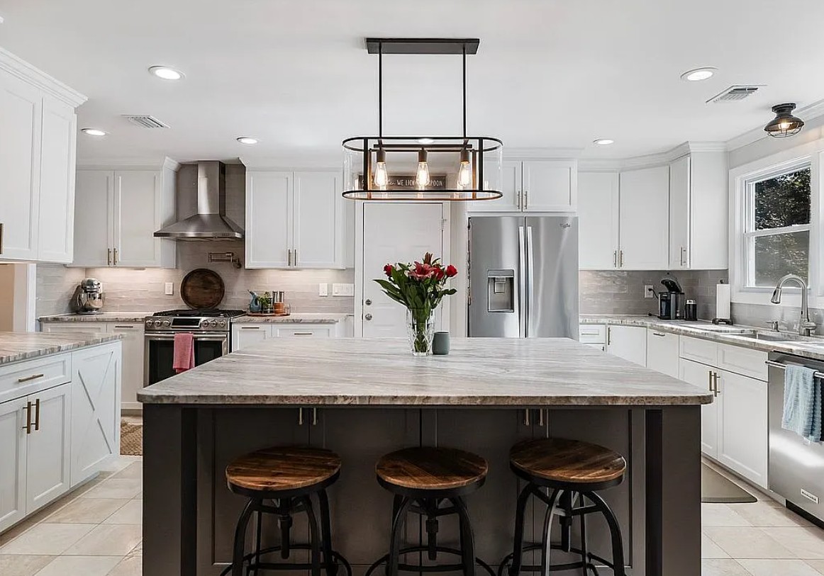 This home features open concept living filled with natural light and showcases a custom chef’s kitchen with a large island, new stainless steel appliances, soft-close cabinets, and a pot filler.