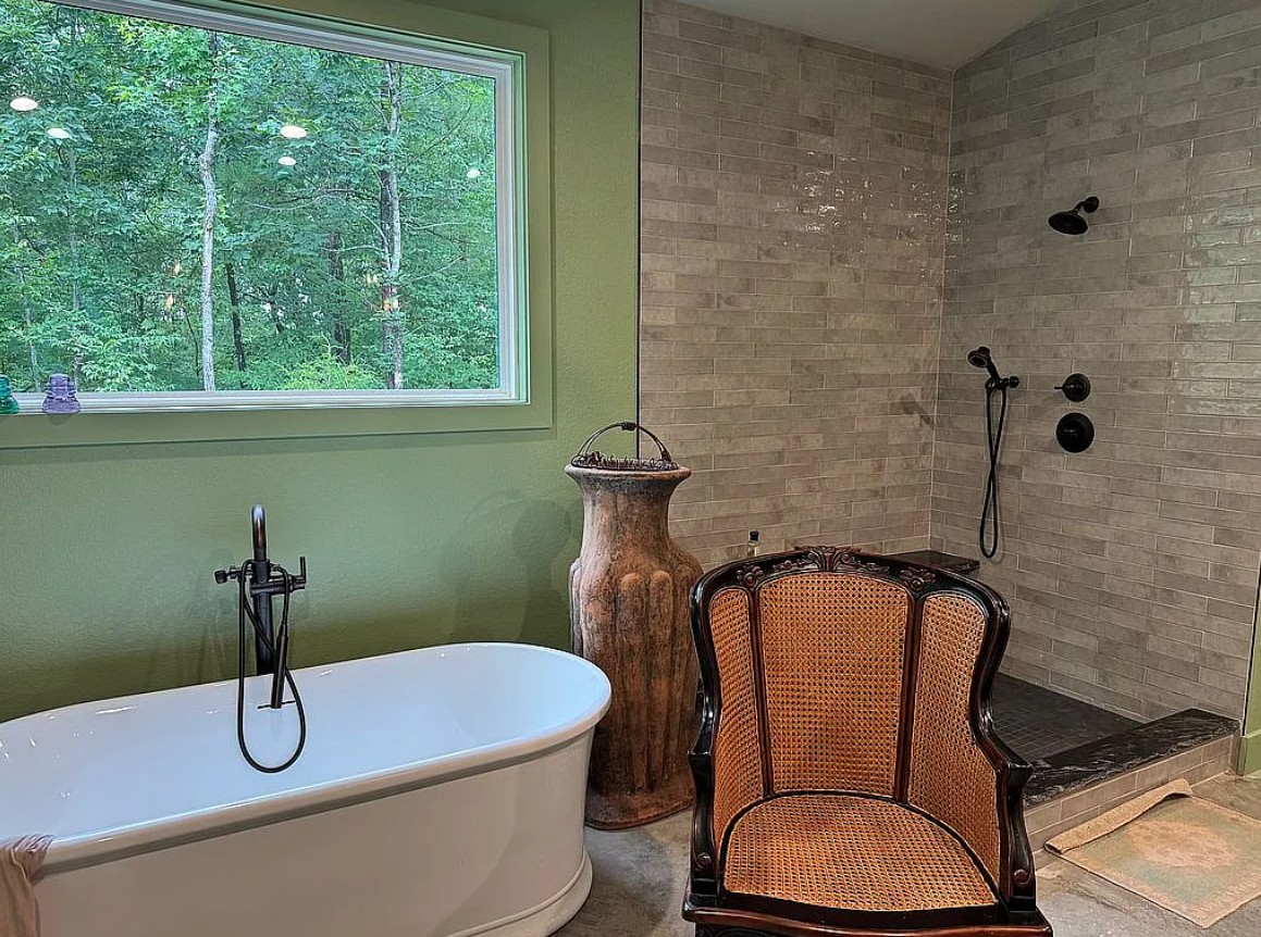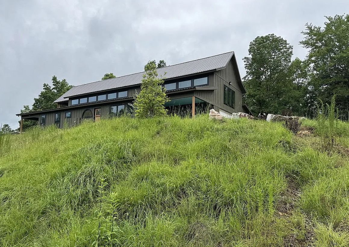 Large windows throughout the home enhance the connection to the surrounding wooded landscape and mountain-style setting.