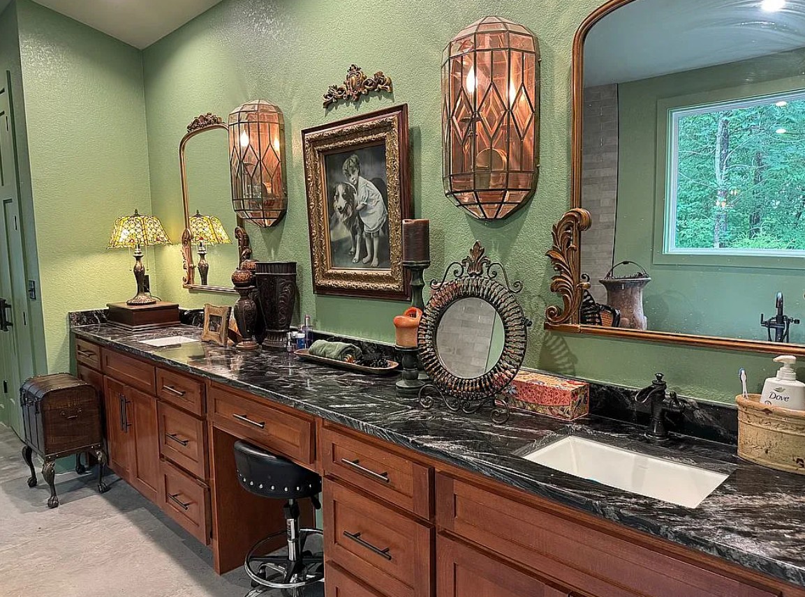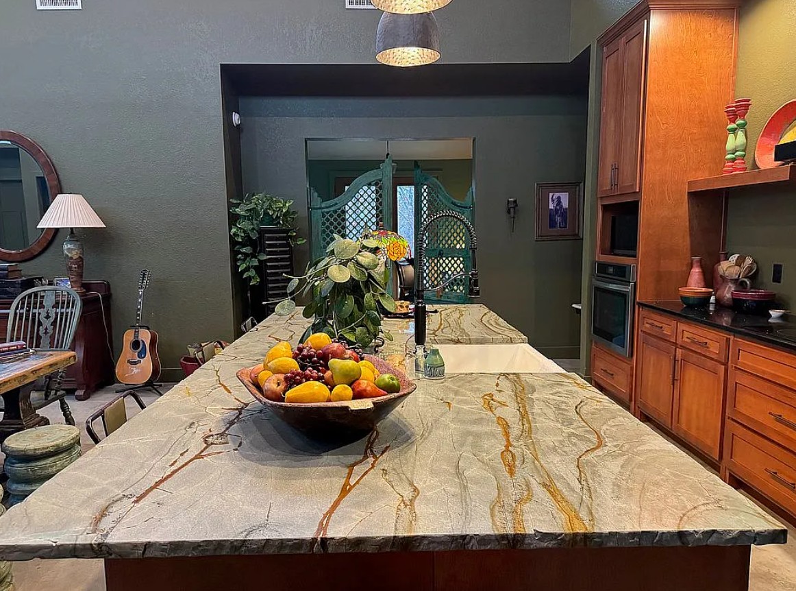 The island kitchen includes wood cabinetry, stainless steel appliances, and a marble-topped island, making it ideal for cooking and entertaining.
