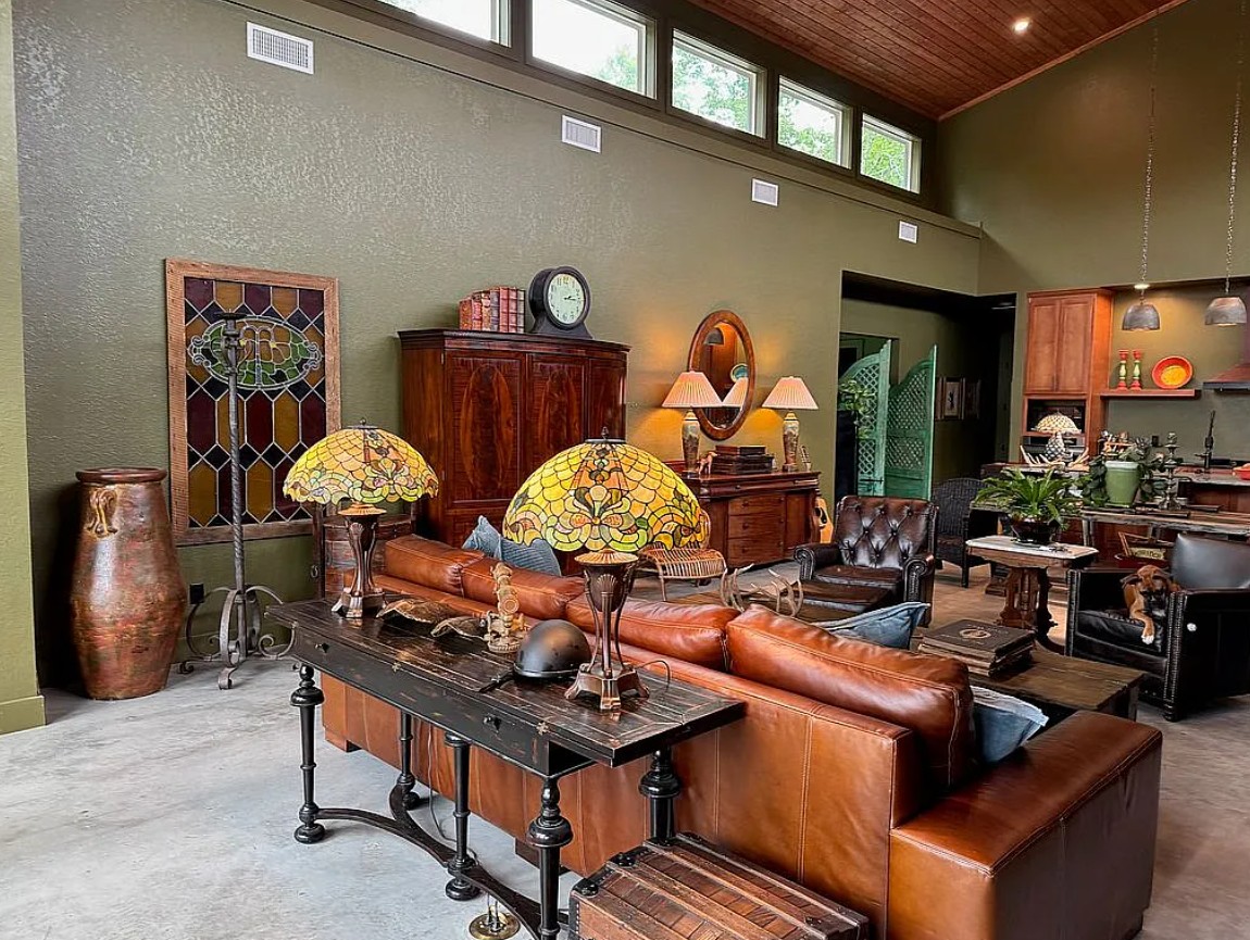 The great room boasts double-height, two story windows, flooding the space with natural light and creating a dramatic focal point.