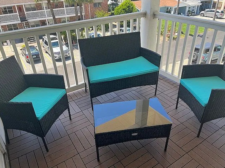 The cozy balcony is perfect for enjoying the ocean breeze and relaxing outdoors.