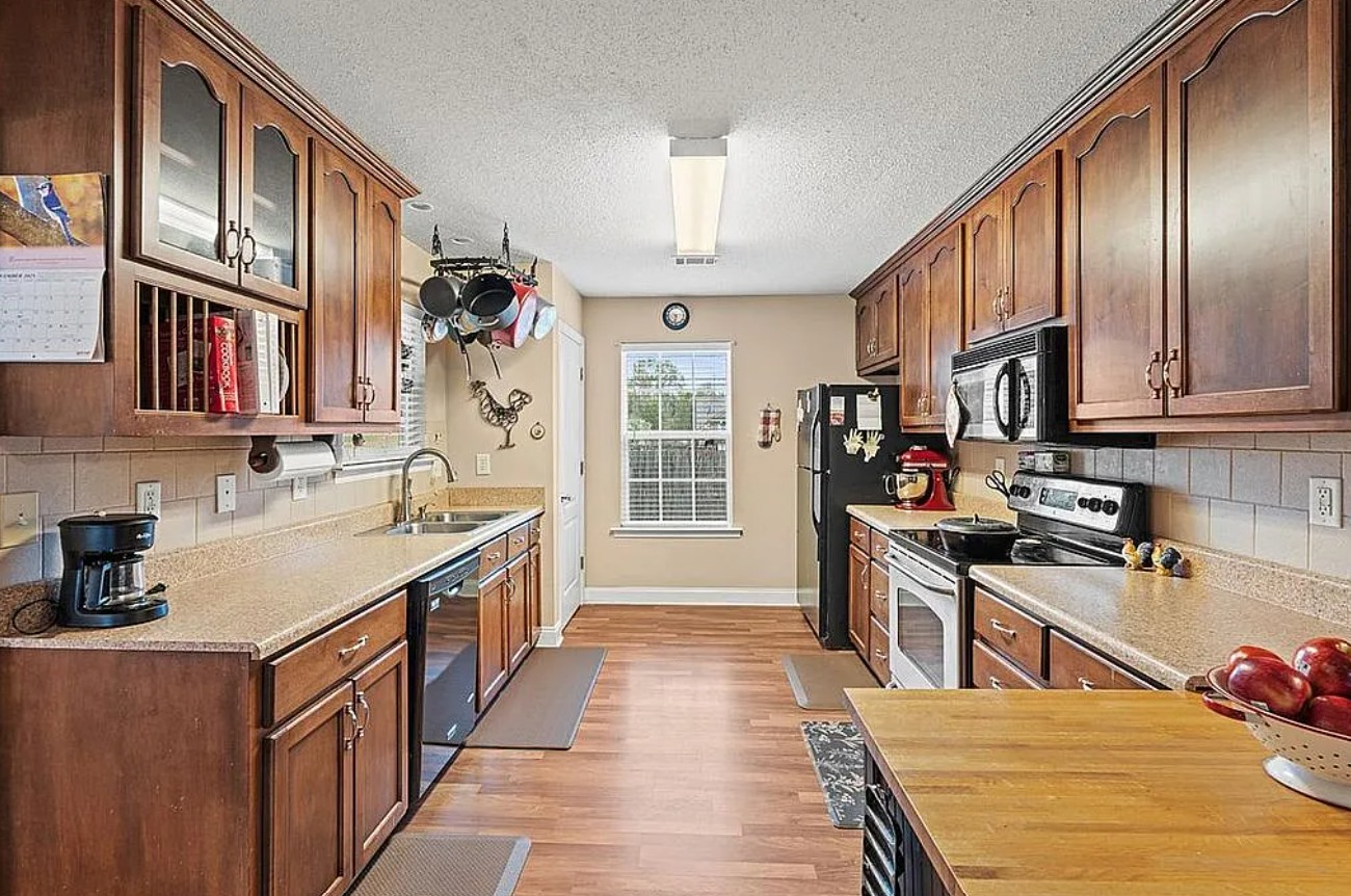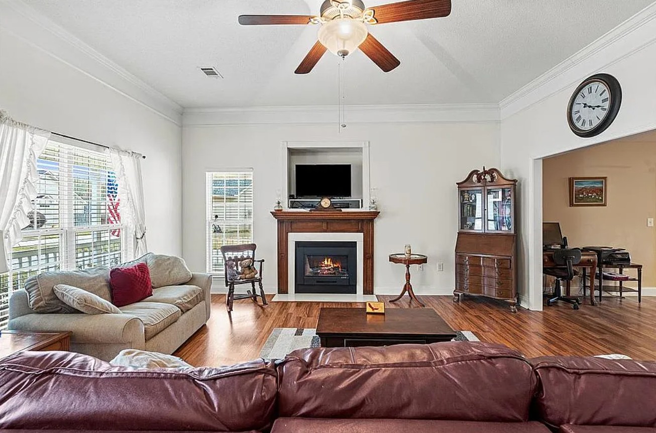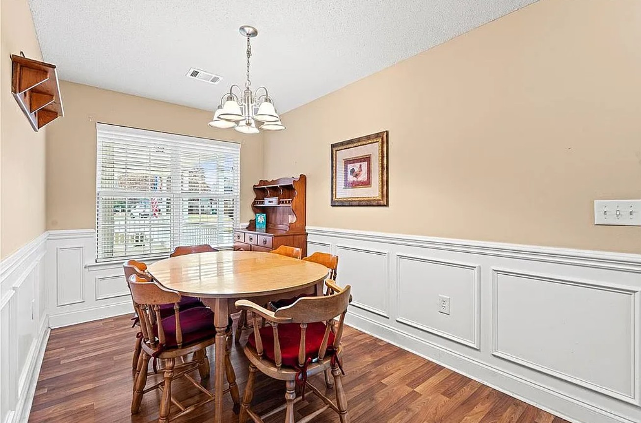This charming home sits on a quiet cul de sac and features a wrap-around porch, perfect for rocking chairs and relaxing outdoors while enjoying the friendly neighborhood atmosphere.