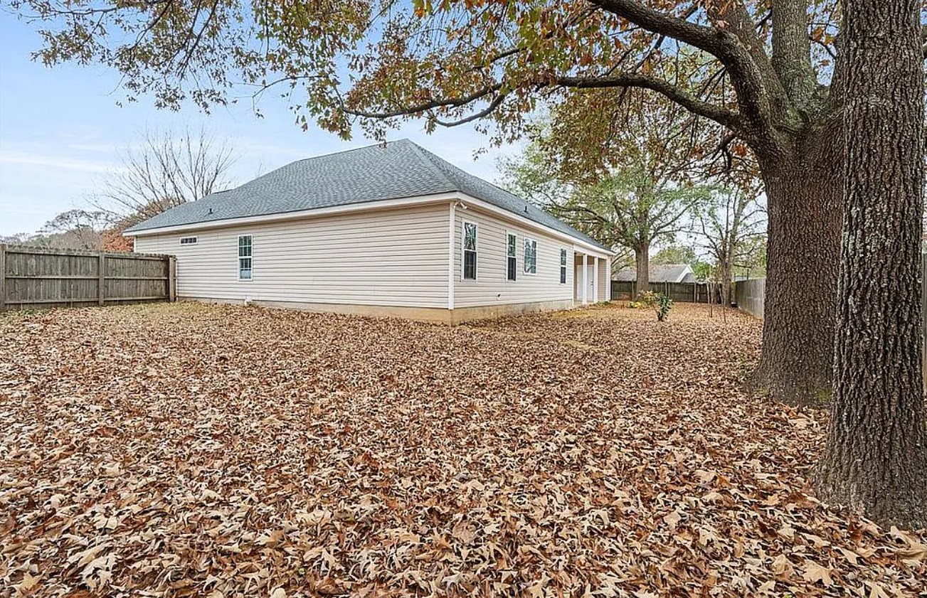 The backyard offers plenty of room on both sides for play areas, gardening, or outdoor activities.