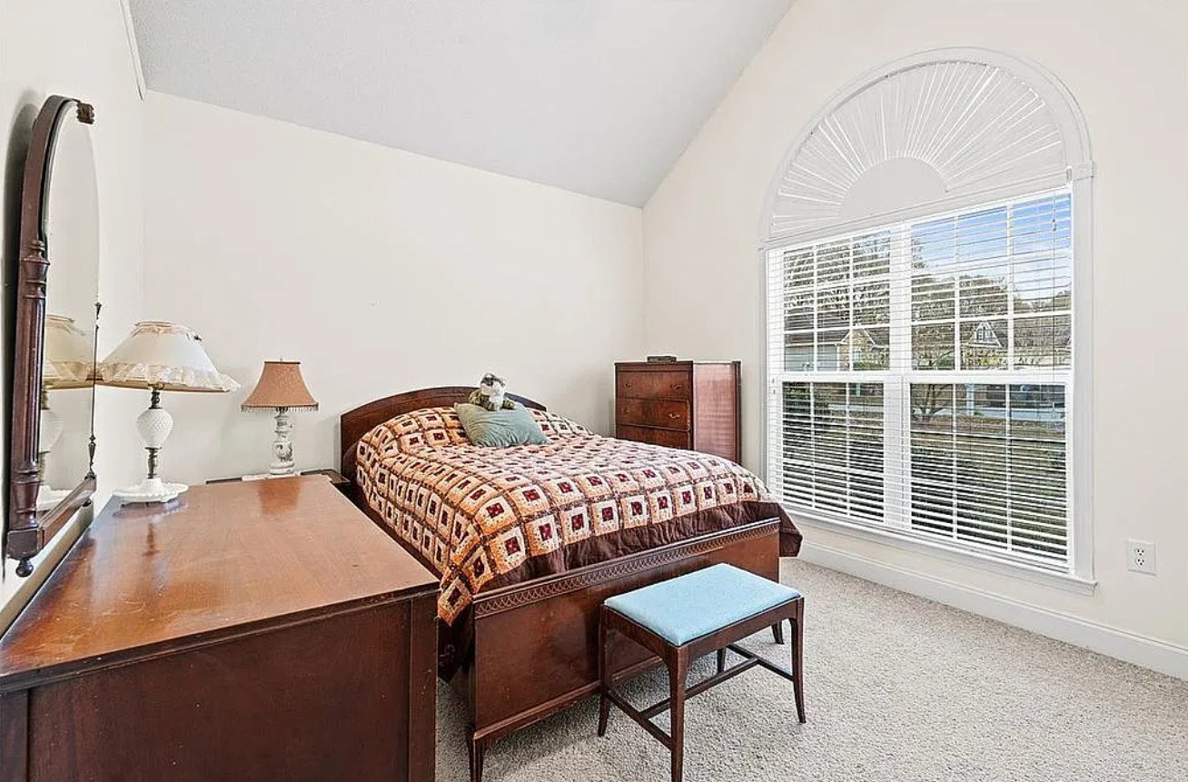 One of the guest bedrooms includes a vaulted ceiling, adding extra character and space.