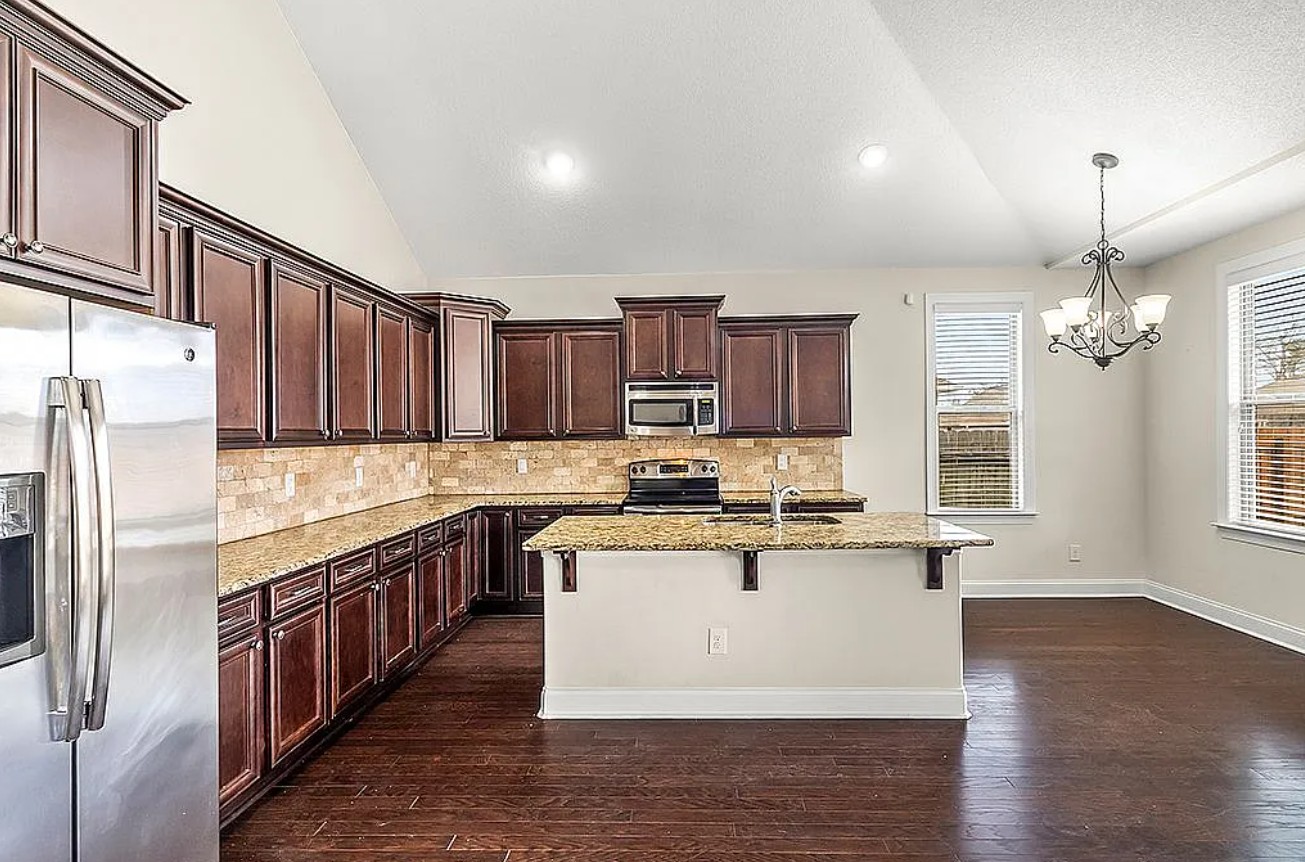The large kitchen island is perfect for hosting and everyday living, offering ample countertop space, generous cabinetry, and room for all your kitchen appliances.