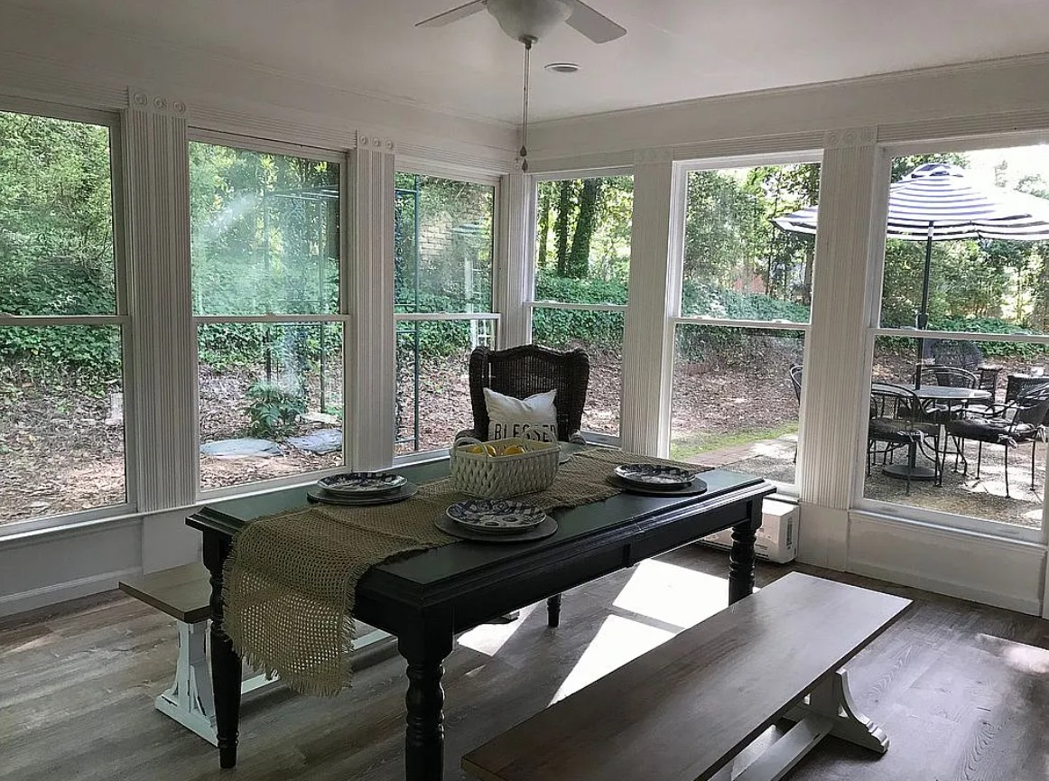 The home features two fireplaces, a 255 square foot glass-enclosed sunroom with a small heat pump, and a large kitchen with ample cabinetry and a pantry.