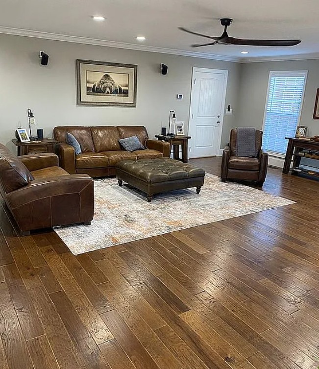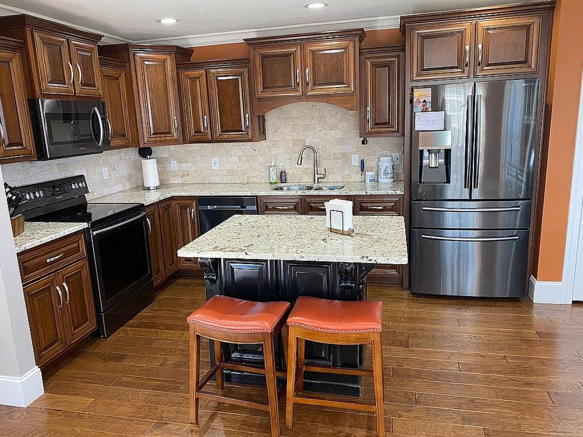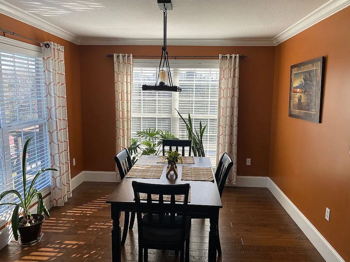 Inside, the home features a large living room and a well-designed kitchen with custom cabinets, a large pantry, sit-at island, and a dedicated dining area.