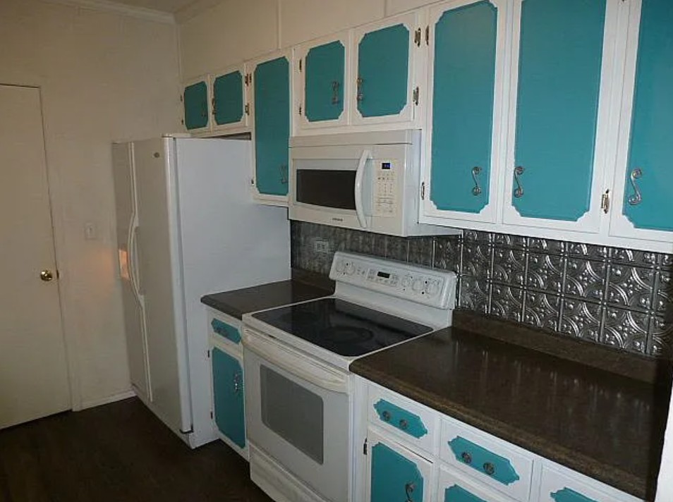 The full kitchen includes a side by side refrigerator, glass top stove, dishwasher, over-the-range microwave, and a cabinet sink, making it move in ready.
