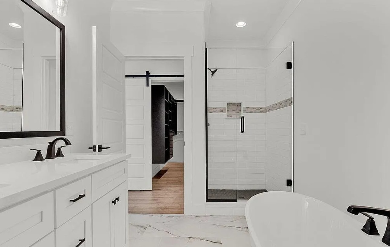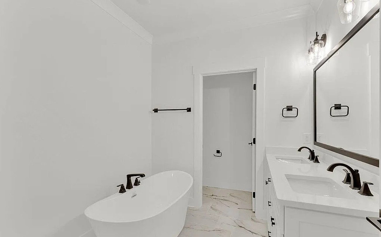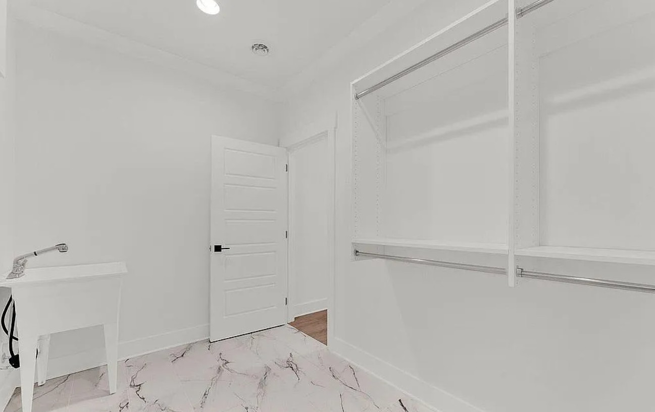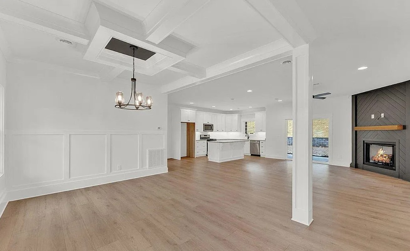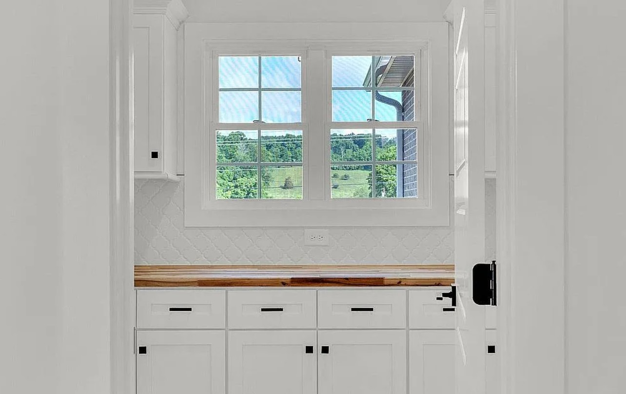 This zero-steps, single-story home features high end finishes including leathered granite countertops, crown molding, waterproof luxury vinyl flooring, and double-hung tilt-in windows.