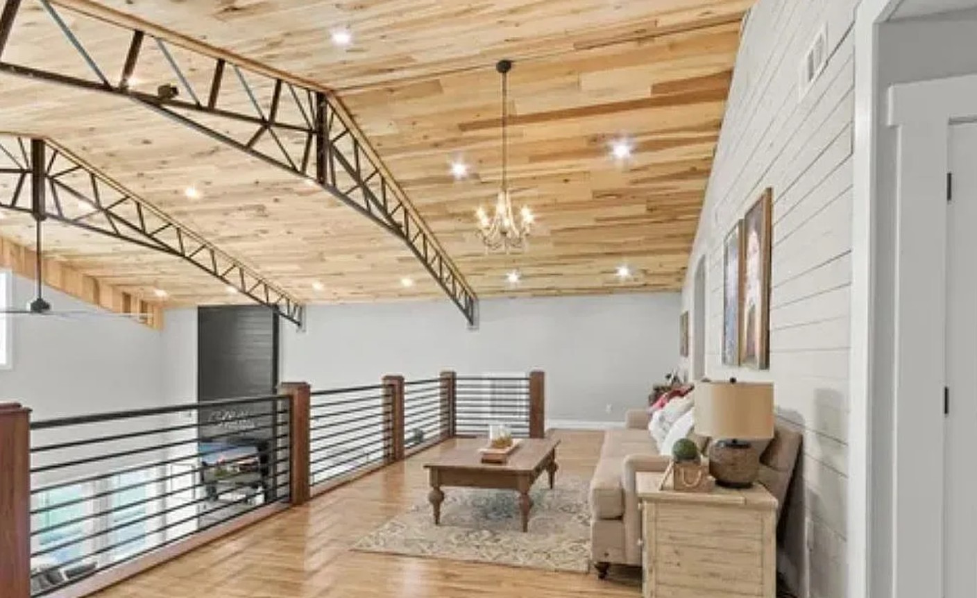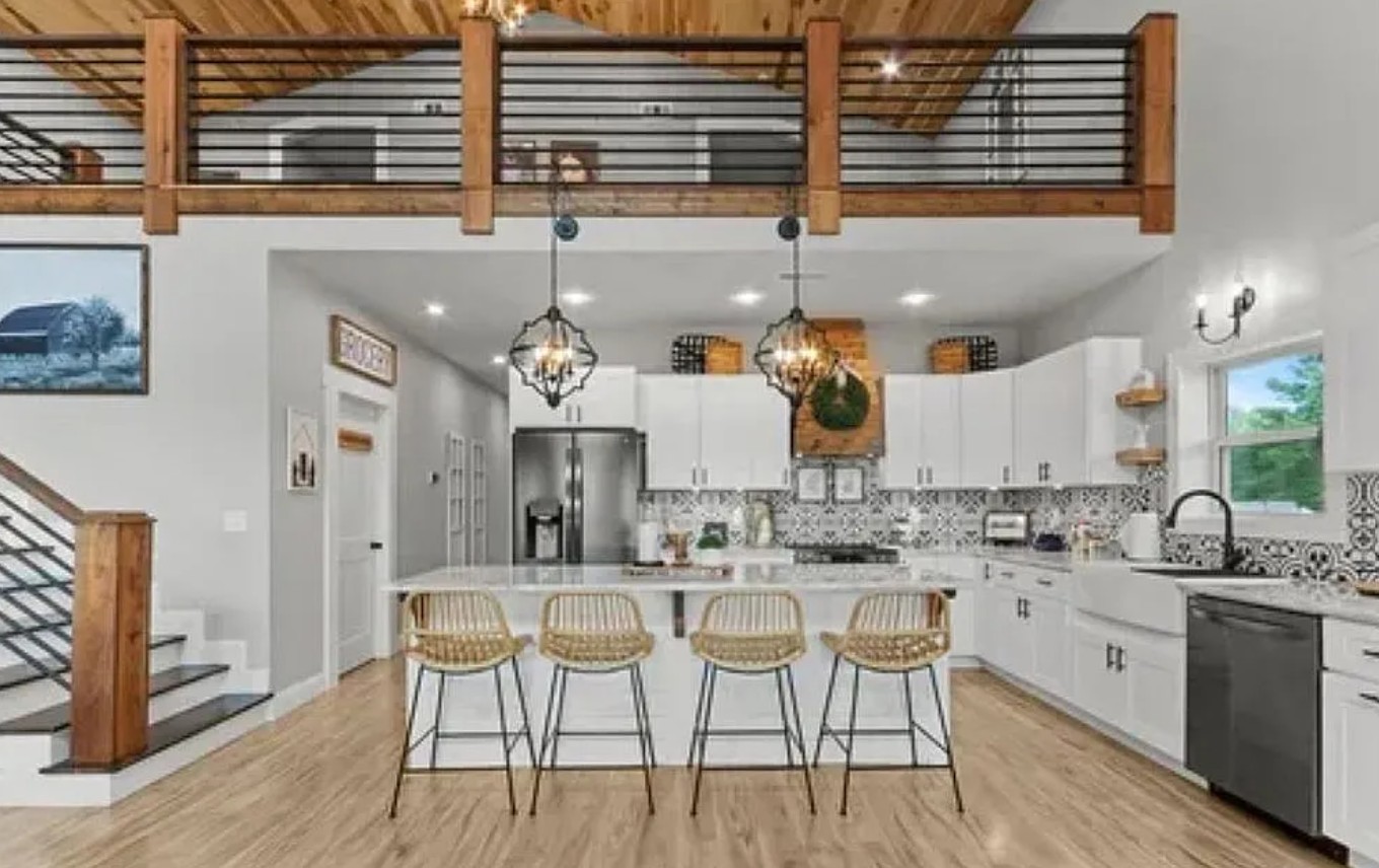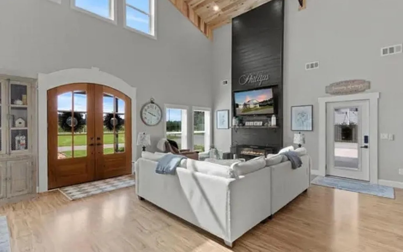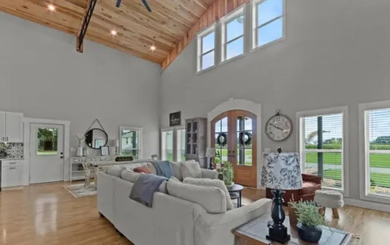 Inside, soaring 20+ foot rainbow poplar wood ceilings highlight the completely open-concept living, kitchen, and dining areas, creating an impressive yet welcoming atmosphere.