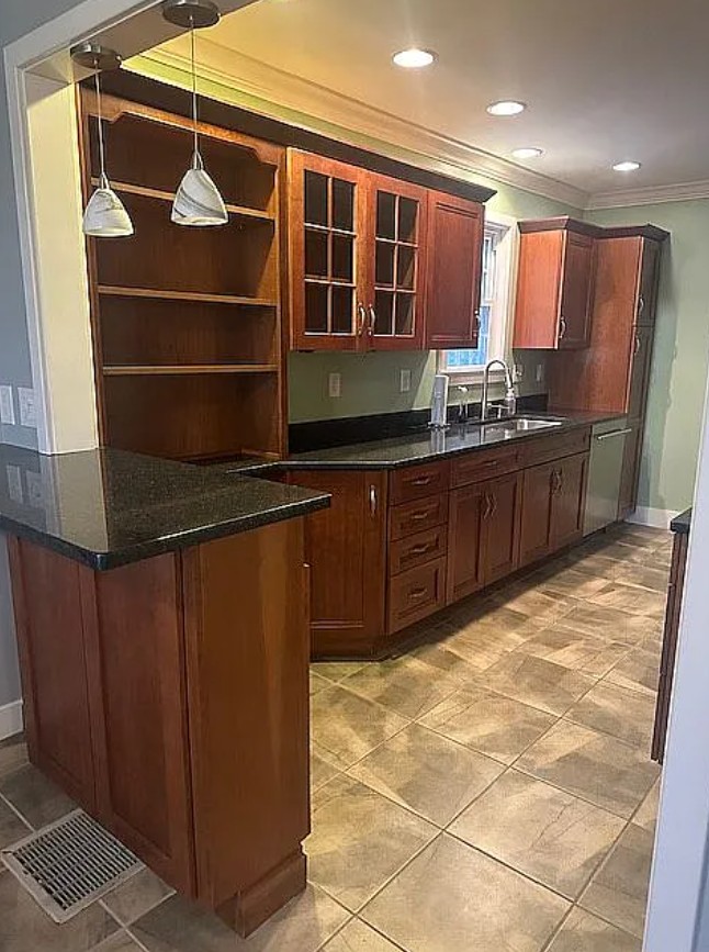 Updated kitchen with granite and quartz countertops, stainless steel appliances, and a kitchen bar with dining area
