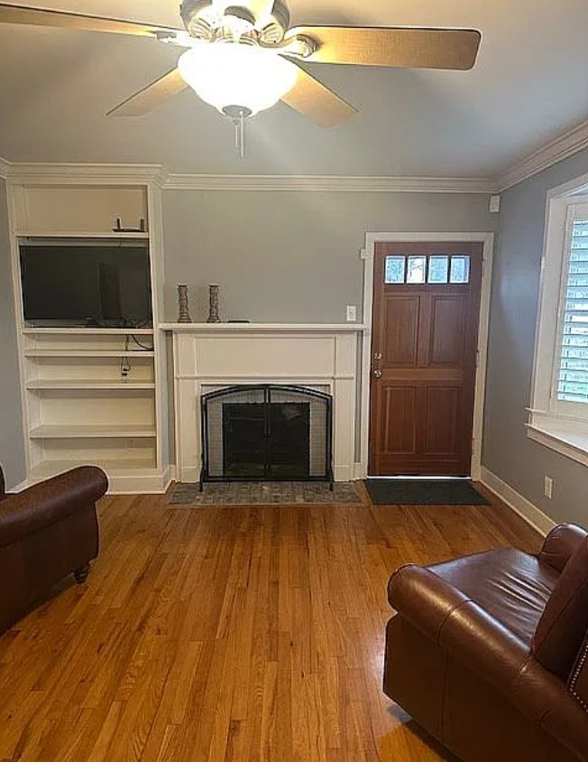 Large living room with built-ins and brick fireplace