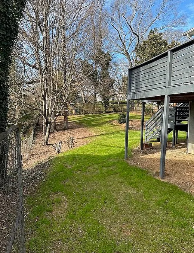 Spacious, fully fenced backyard with terraced planters