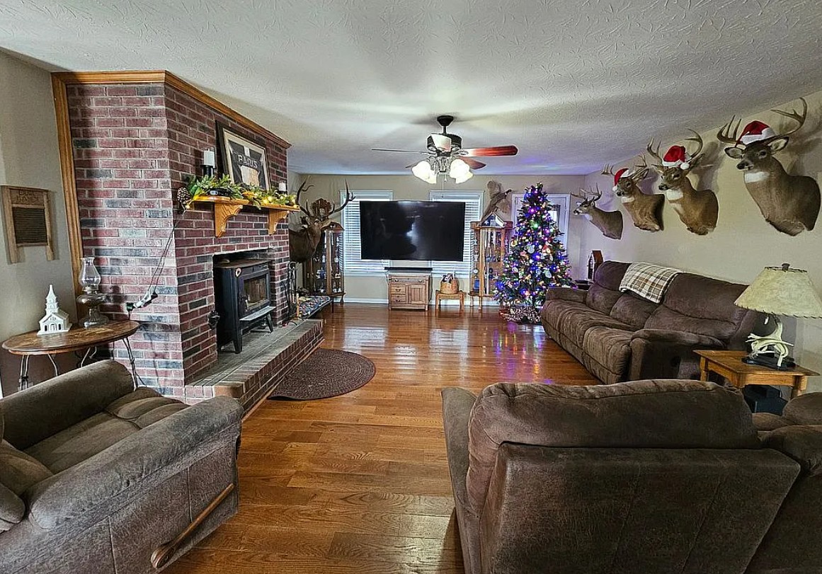 The living room is highlighted by a cozy wood stove, creating warmth and charm during cooler months.