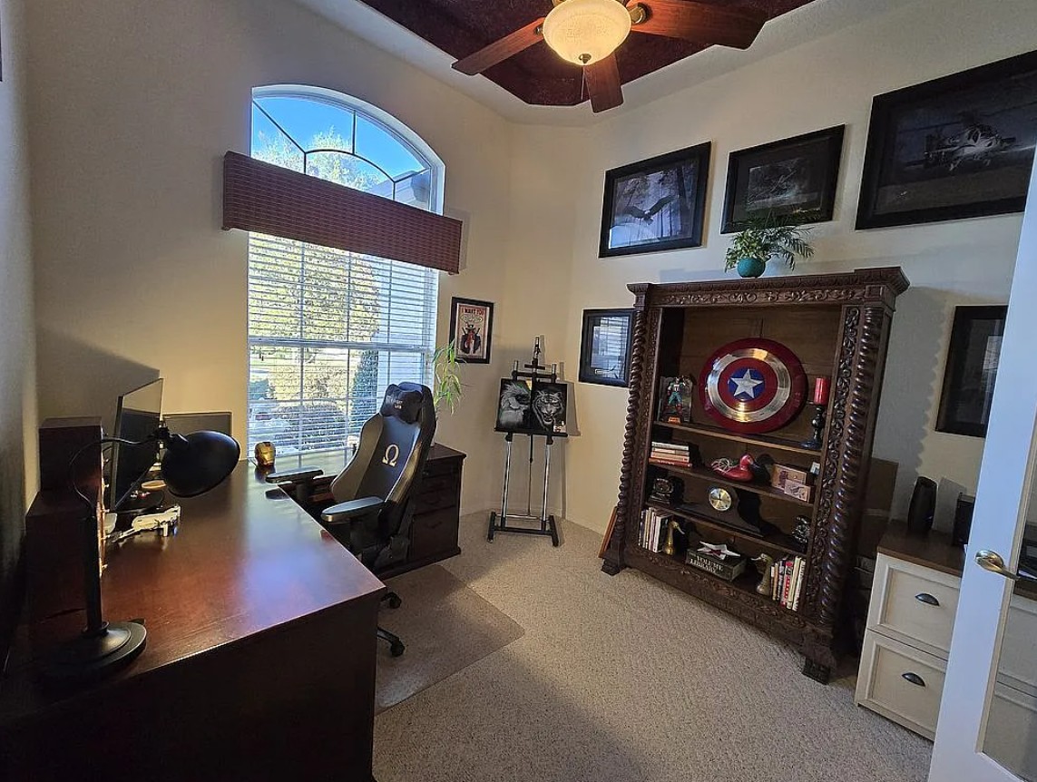A large office, formal living room, elegant dining area, and spacious family room with built-ins and fireplace provide versatile living and entertaining spaces.