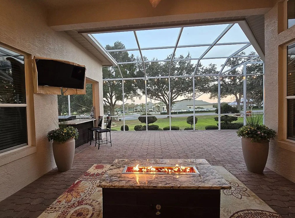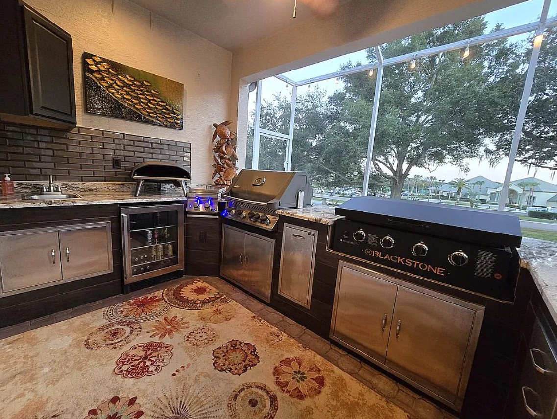 Step outside to your covered lanai with a fully equipped natural gas outdoor kitchen, featuring a 36" Napoleon BBQ grill with infrared rotisserie, double burner stovetop, Ooni pizza oven, Blackstone griddle, mini fridge, sink, abundant storage, and an outdoor mounted TV.