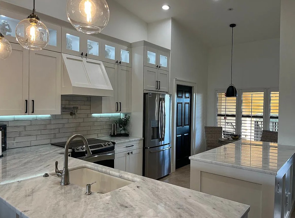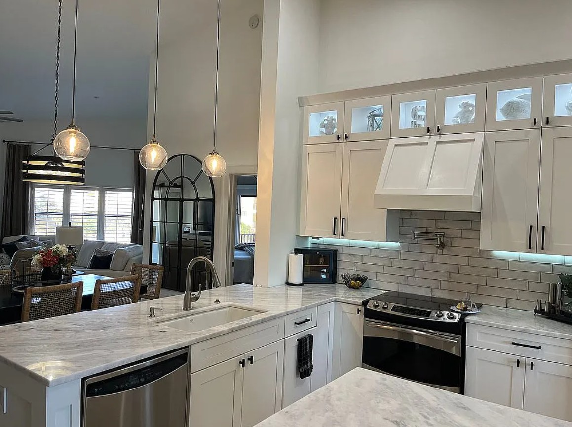 The beautifully updated kitchen showcases white shaker cabinetry with lighted upper cabinets, elegant white quartzite countertops, and GE Profile stainless steel appliances.
