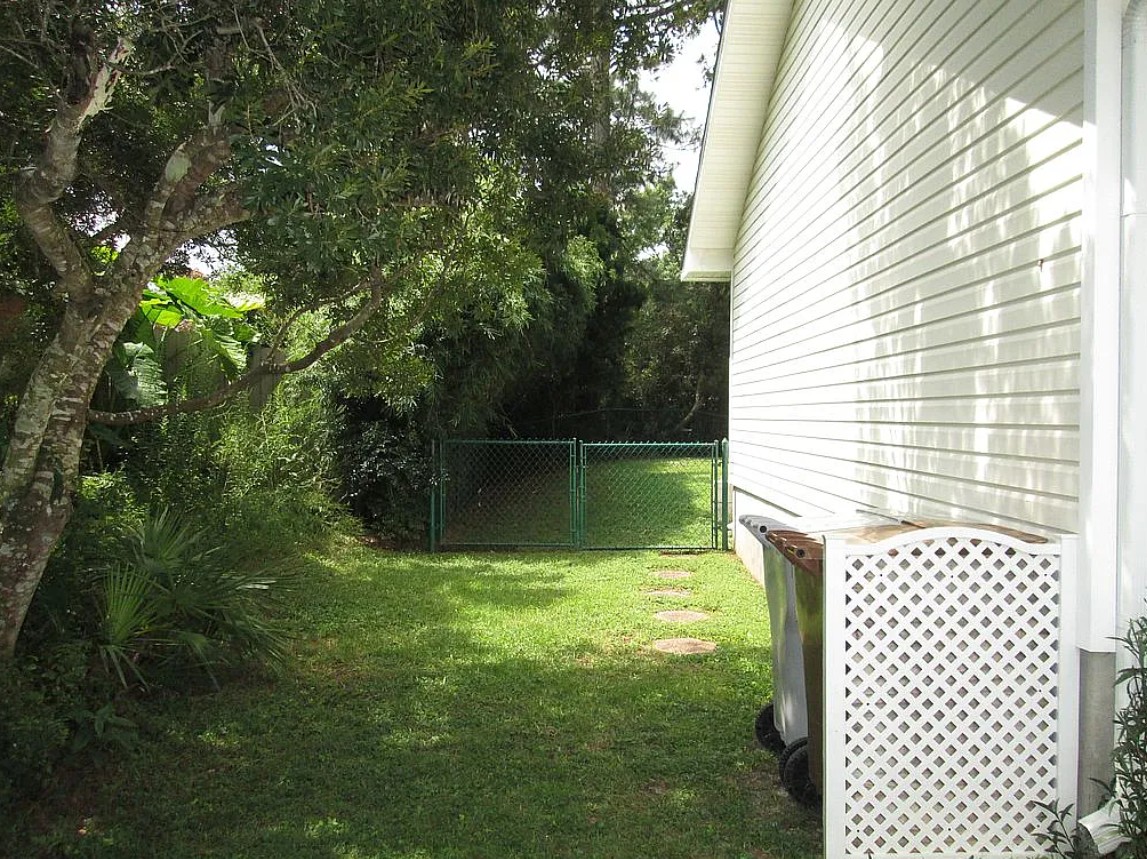 The very private backyard features mature trees, a natural 10-foot wooded buffer, a green aluminum chain-link fence with three gates, and sliding glass doors leading to a cement patio.