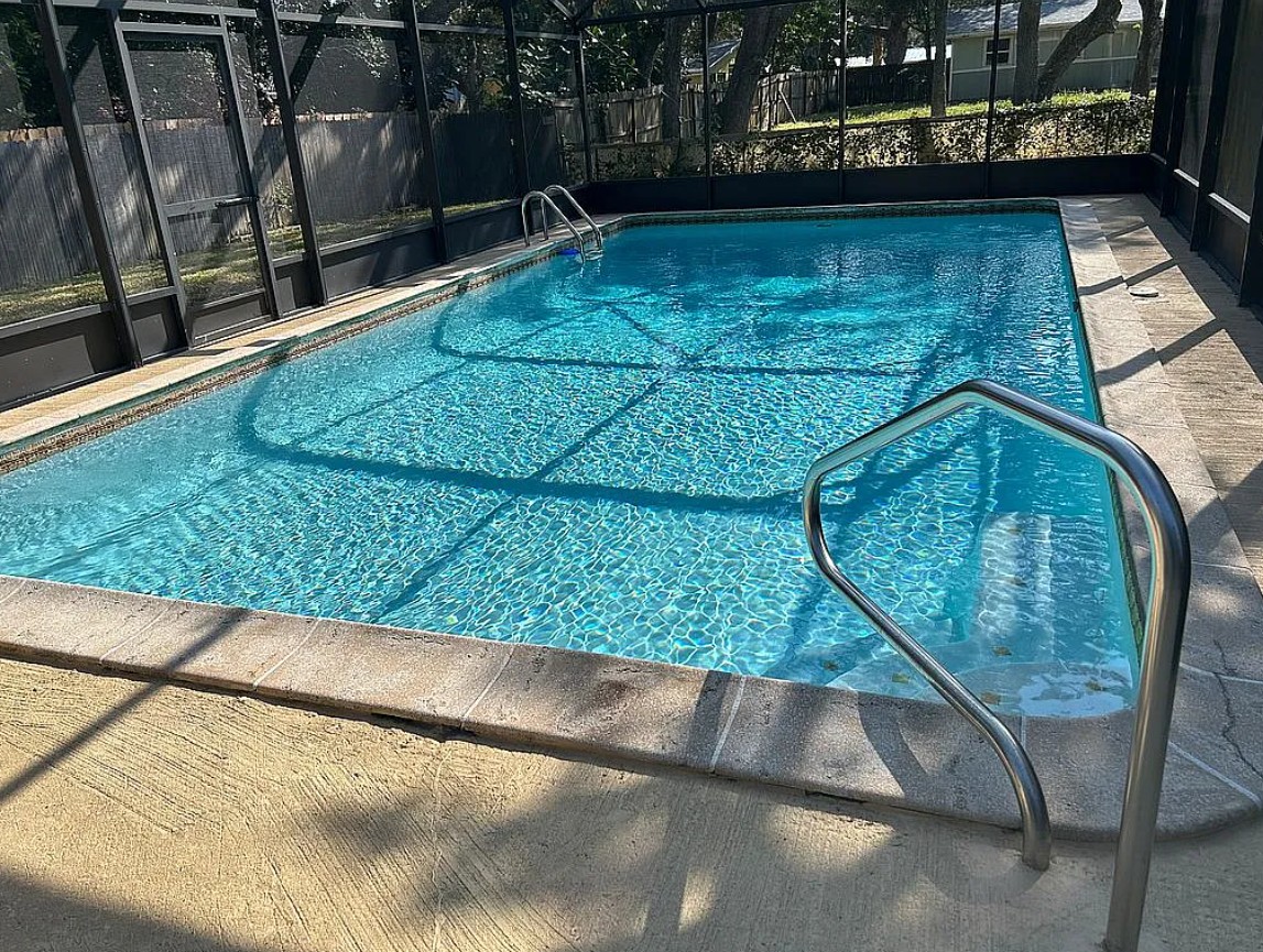 The home features a private 8 foot-deep swimming pool, fully resurfaced in 2022, ideal for relaxing or entertaining.