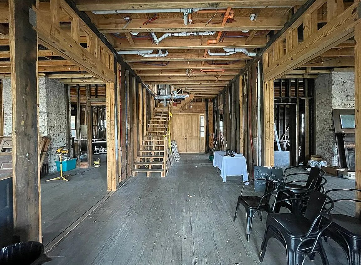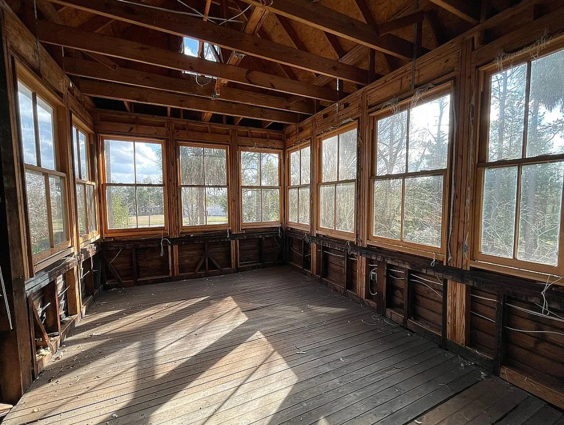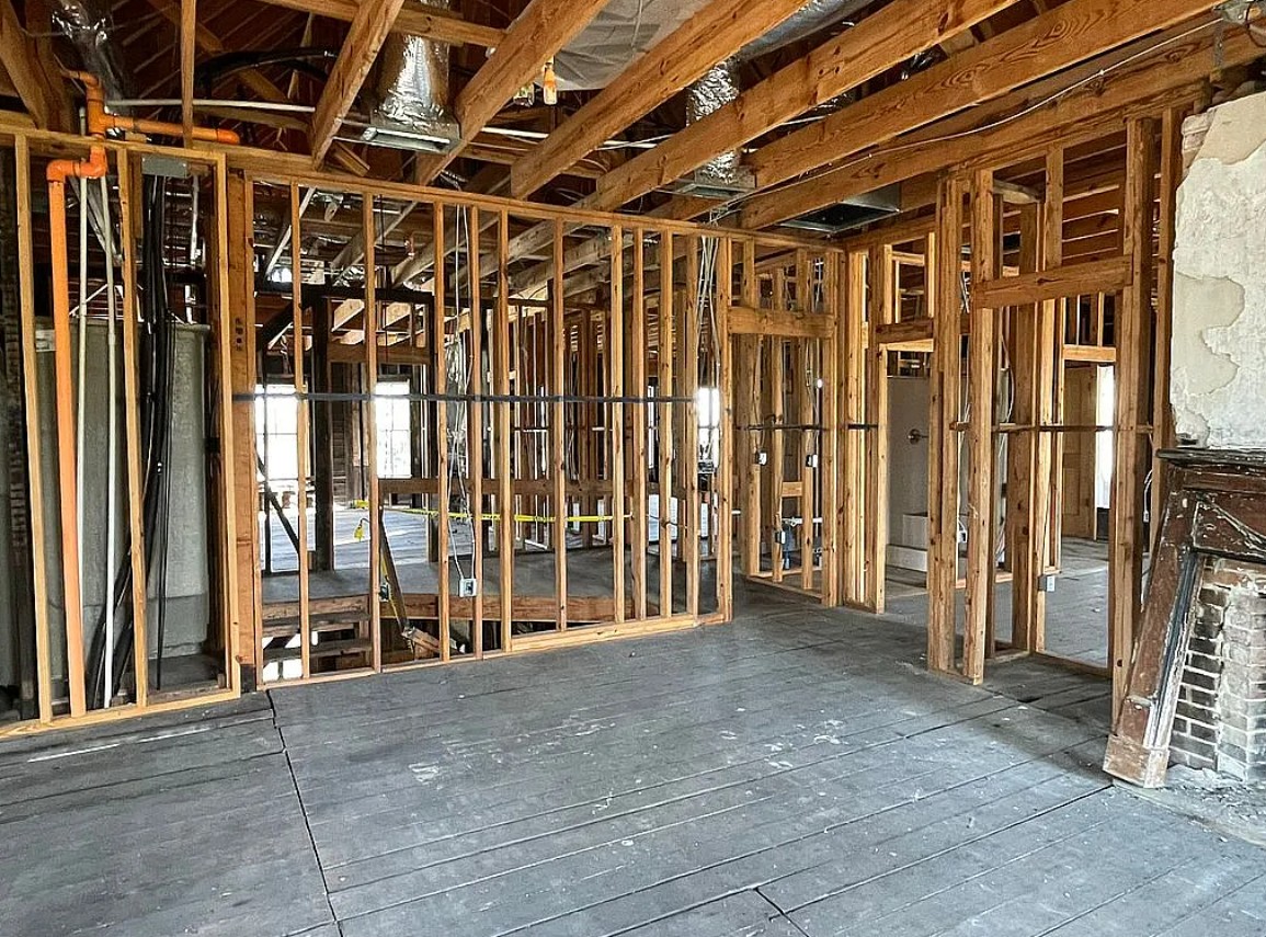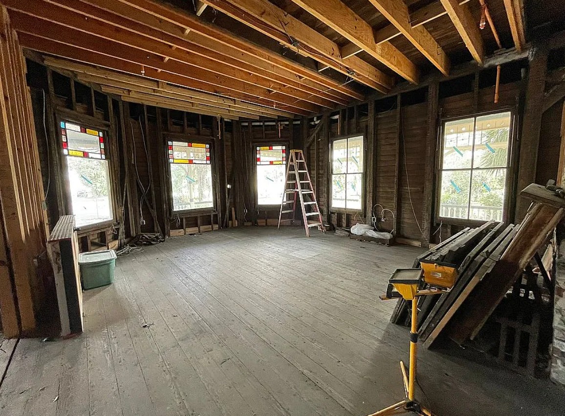 Though affected by fire damage in 2011, the property has been thoughtfully stabilized, with significant work already completed, including rebuilt structural framing, stabilized roof and porch, and the installation of modern fire suppression and HVAC systems, along with key infrastructure upgrades.