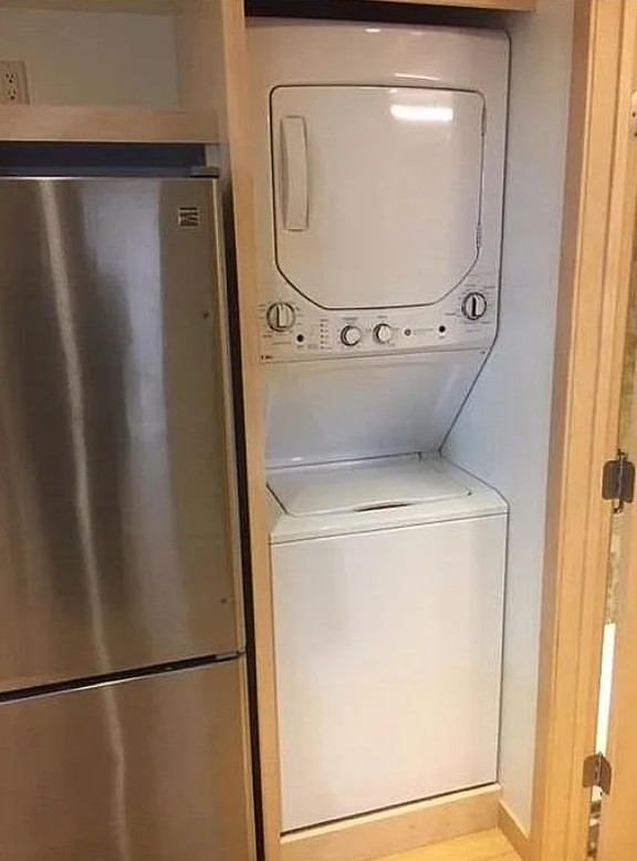The well-appointed, all electric kitchen features maple cabinetry, stone countertops, stainless appliances including a convection range, microwave, dishwasher, and a stacked washer and dryer for convenience.