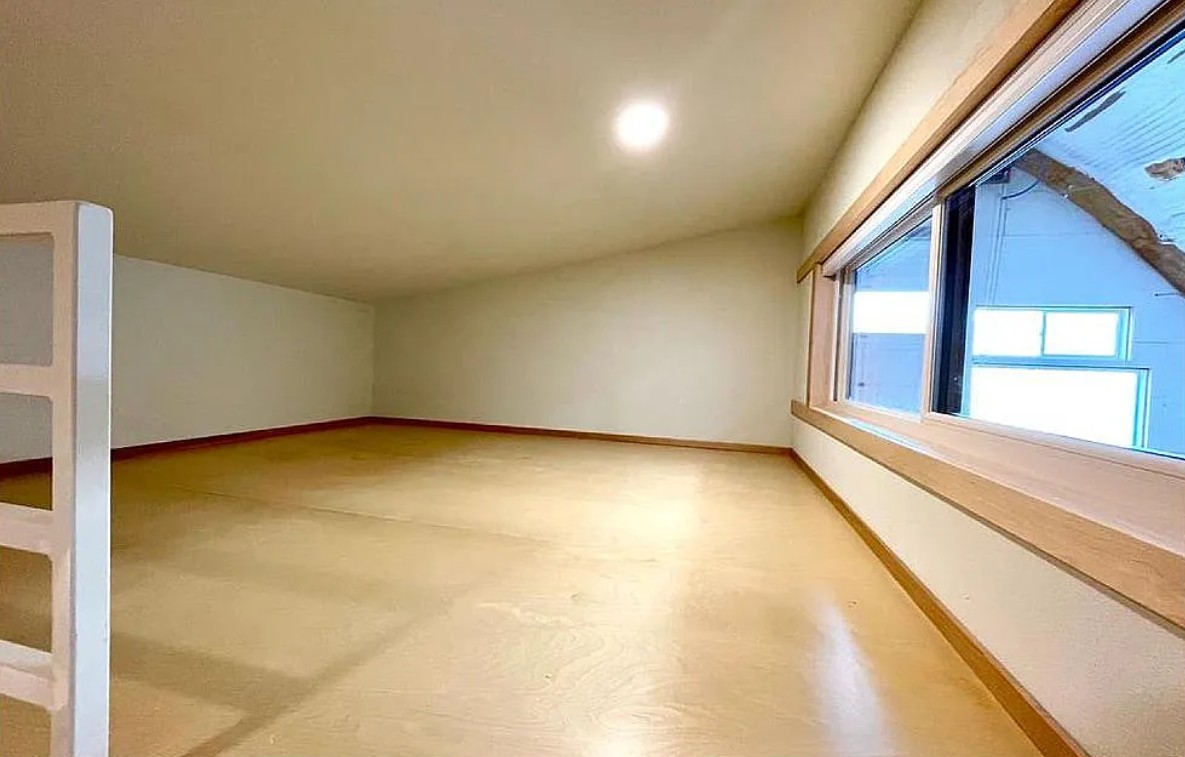 A spacious bathroom offers a large walk in tile shower with glass door, stone-top vanity, linen storage, and a Toto toilet, while the second floor loft provides flexible space for an additional sleeping area or storage.