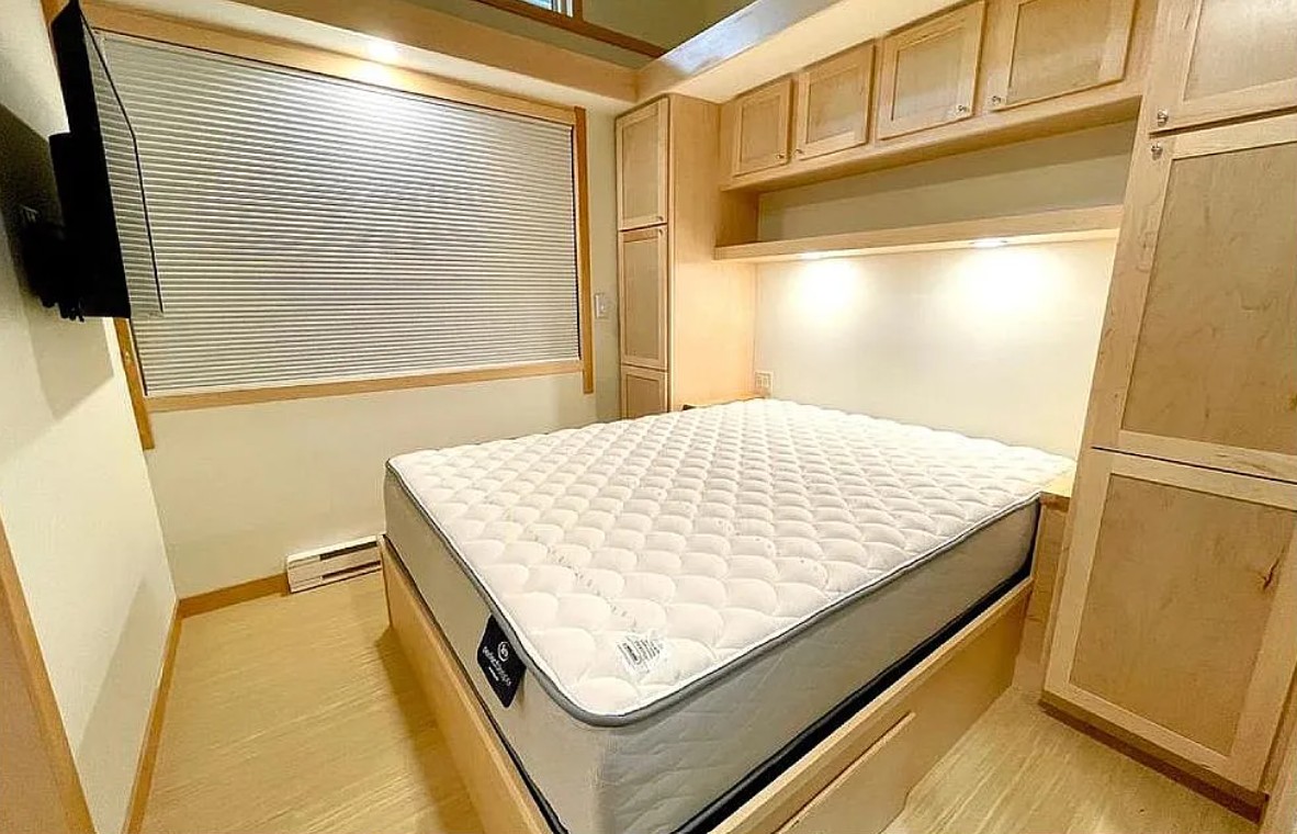The interior showcases clean modern finishes with white walls and maple trim, custom built-ins, USB outlets, and excellent storage throughout, including a built in storage bench.