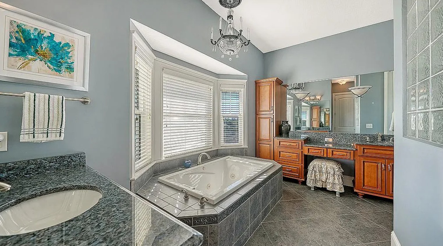 Each of the three spacious bedrooms is en suite, with the primary suite featuring a large jetted tub, separate walk-in shower with its own water heater, double sinks, a dressing vanity, and an oversized walk-in closet.