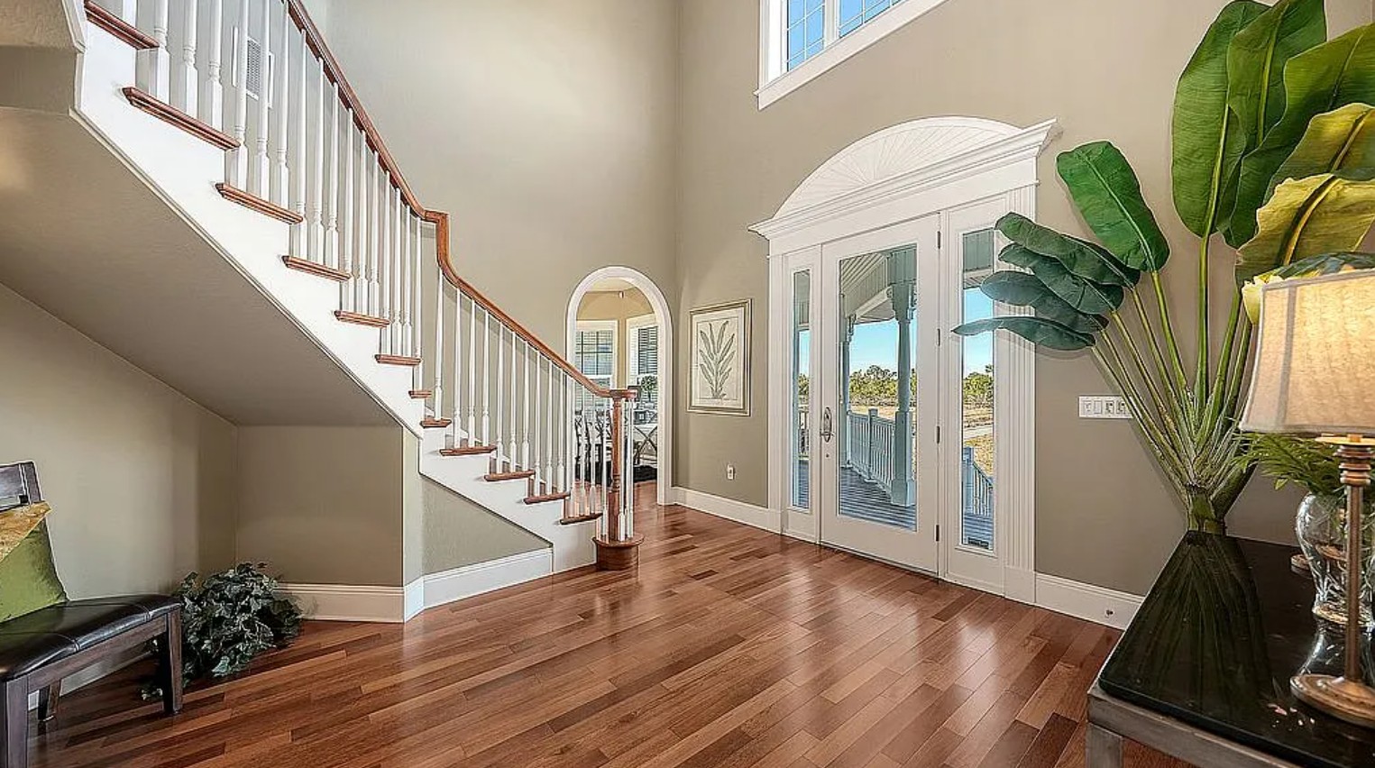 The grand foyer with a sweeping staircase leads to well-designed living spaces, including two dedicated offices and a bright morning room.