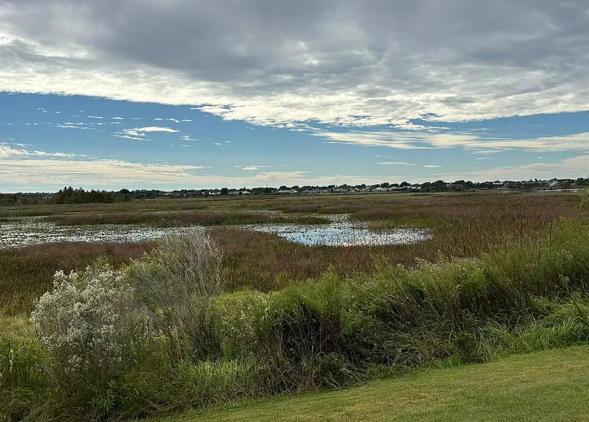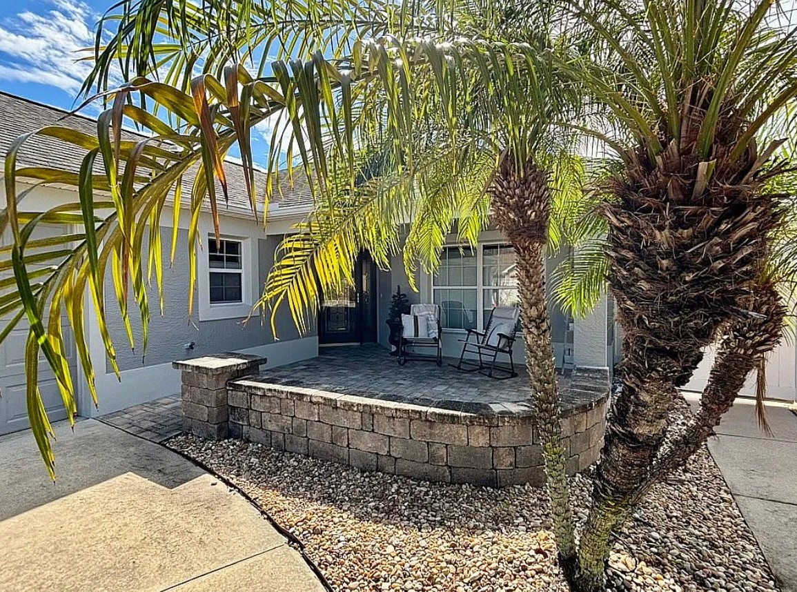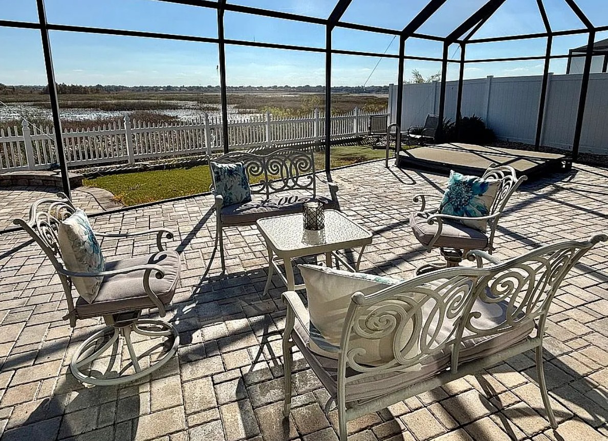 Additional features include a full two-car garage, keypad front-door entry, a remote-controlled Sunbrella awning over the birdcage-enclosed cobblestone patio, and a maintenance-free, zero scaped oversized lot with sweeping views toward Sumter Landing.