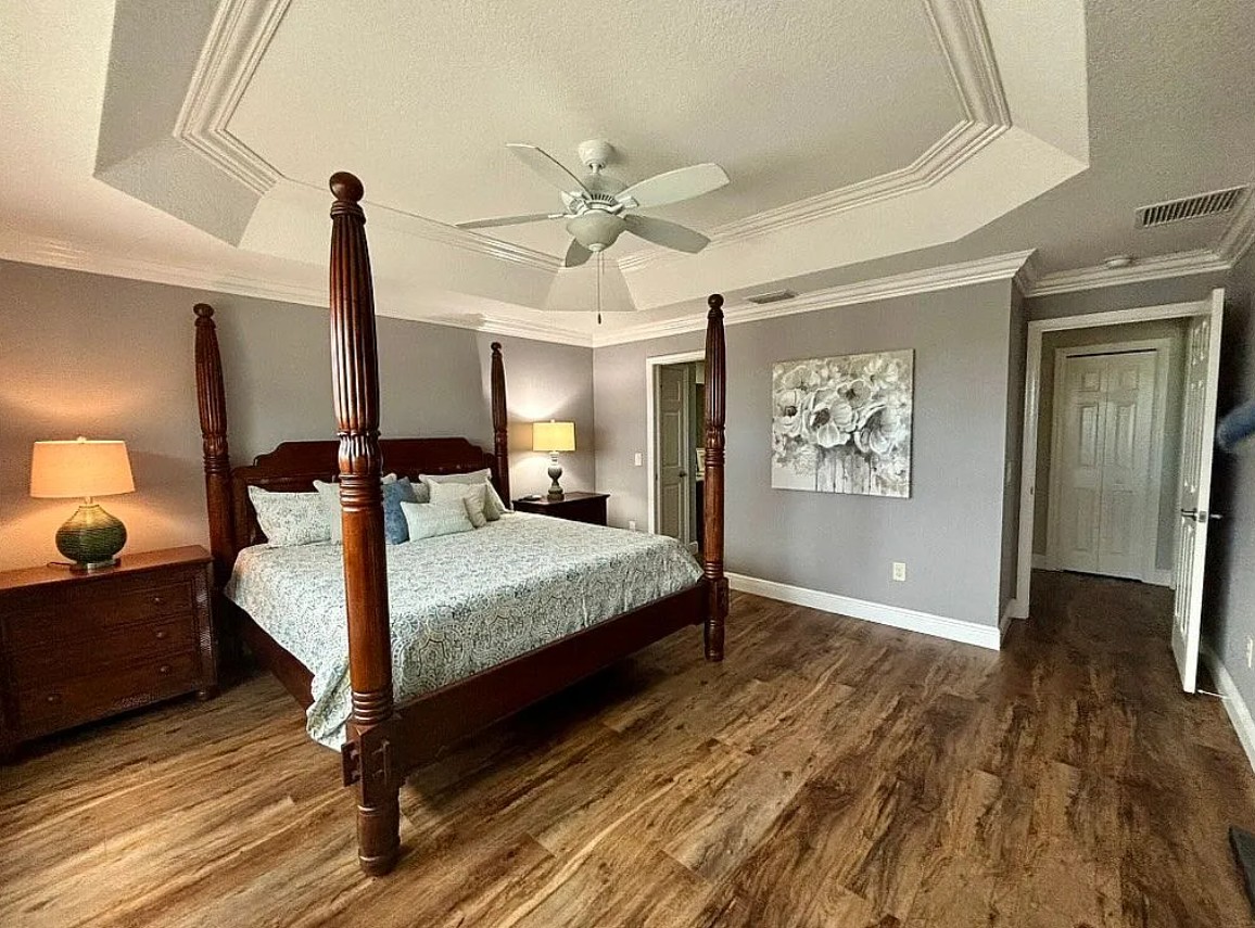 Highlights include volume ceilings, a tray ceiling in the primary bedroom, crown molding throughout, and luxury vinyl plank flooring for easy maintenance.