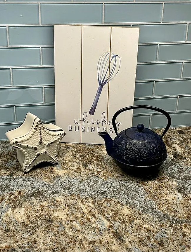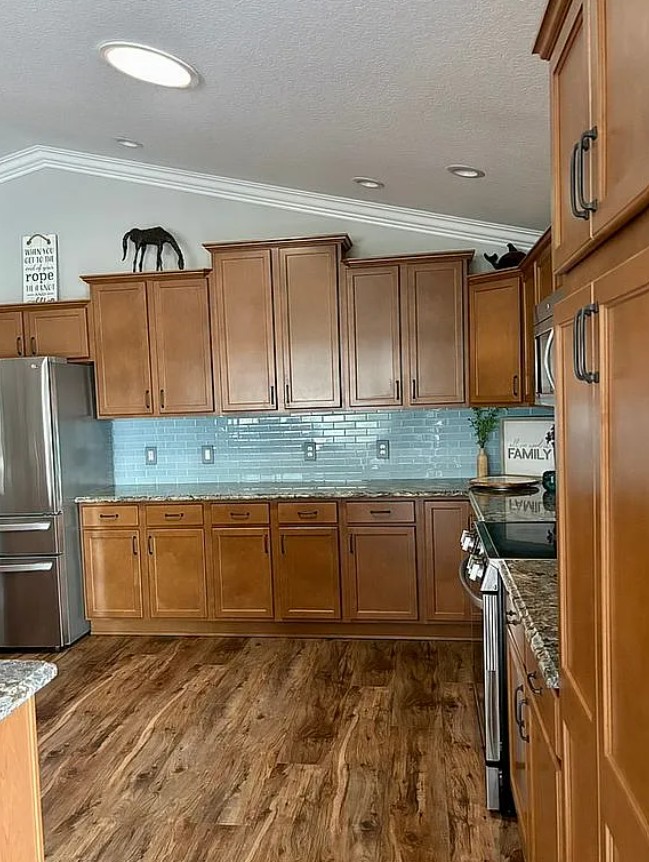The spacious kitchen features one of a kind granite countertops, an eye-catching glass tile backsplash, and upgraded fixtures and lighting.