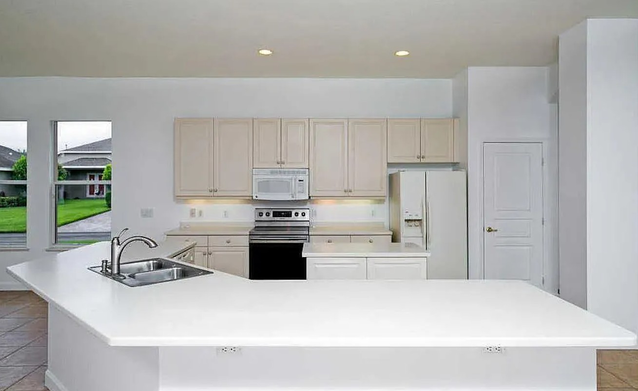 The oversized kitchen features a casual breakfast bar and opens seamlessly to the family room, providing a comfortable and functional gathering space.