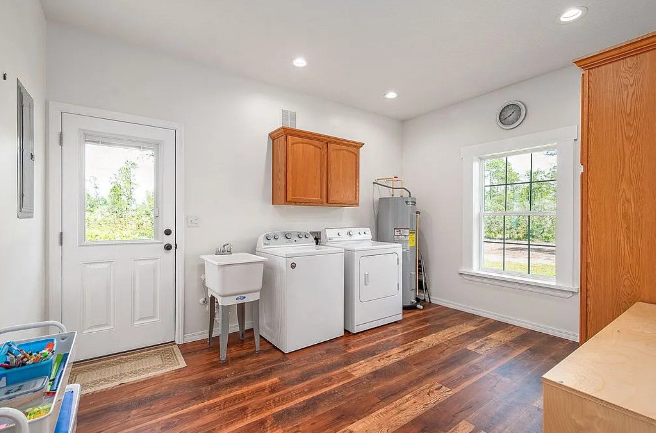 A large laundry room with utility sink and whole house water filtration with a high-capacity well make this property functional for family living and livestock.