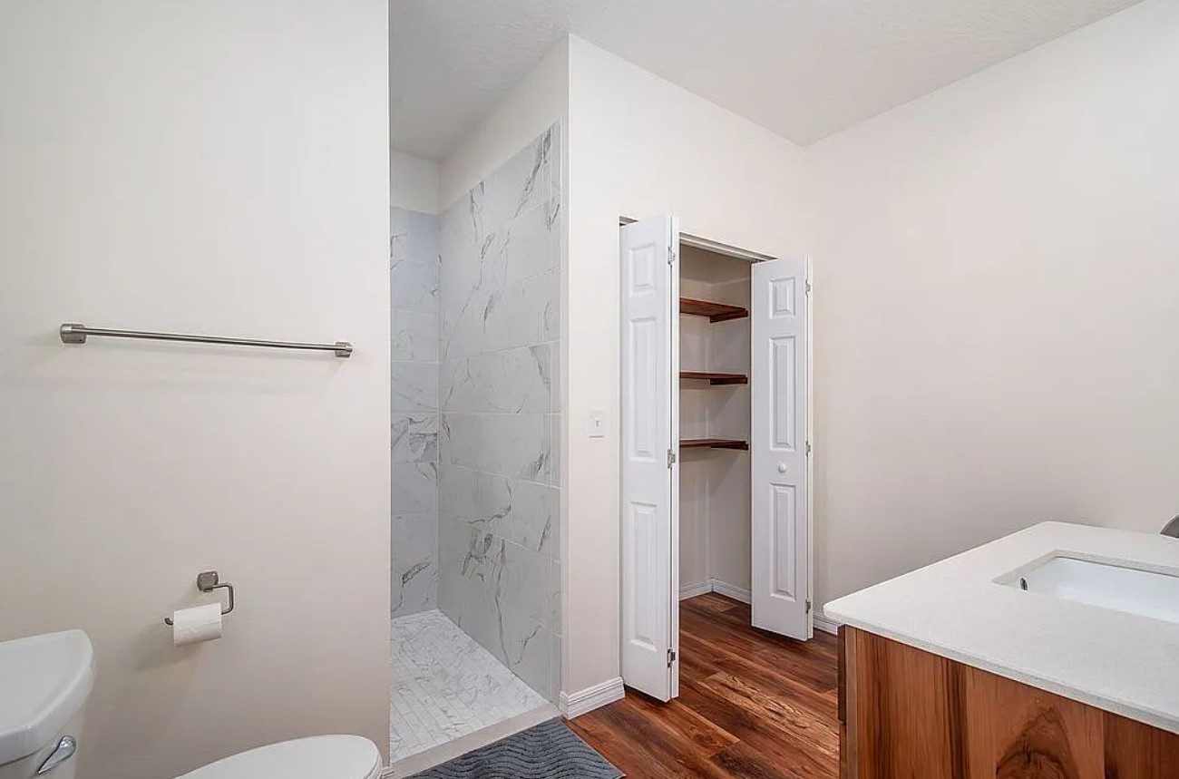 The home, built in 2022 with durable, quality materials, boasts cathedral ceilings, a spacious open floor plan, and a large kitchen with all-wood cabinets, quartz countertops, a large island with bar, and a walk in pantry.