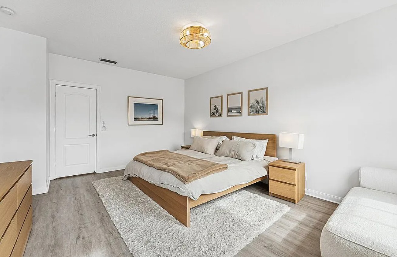 The fully renovated interior showcases laminate flooring, designer lighting, and an exquisitely updated kitchen with quartz countertops, modern cabinetry, and sleek finishes.