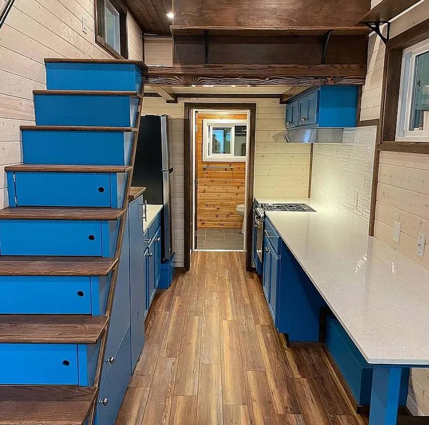 Professionally built just four years ago, this 30 ft long, 8 1/2 ft wide tiny house trailer features luxury vinyl flooring, quartz countertops, stainless steel appliances, and thoughtful high-end finishes throughout.