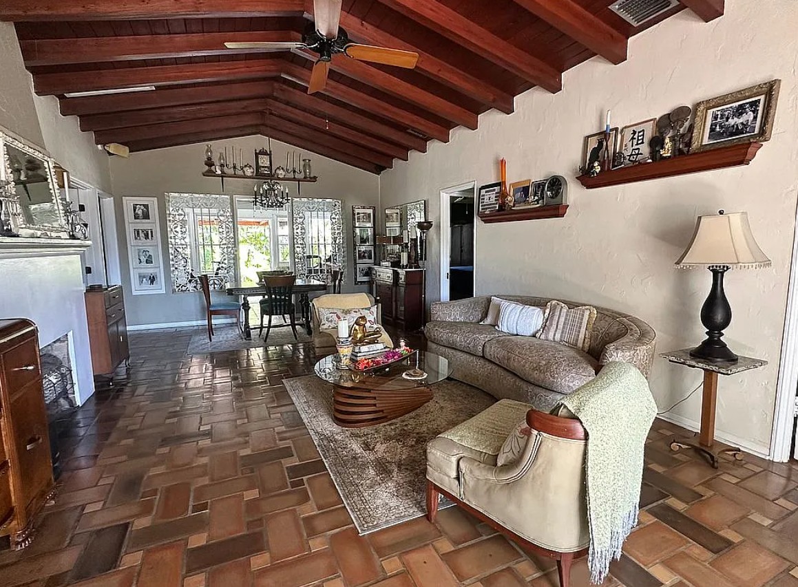 This 2 bedroom, 2 bathroom home with a flexible third room (ideal for a bedroom, den, or home office) is filled with beautiful original character throughout, including original Spanish tile floors, hardwood flooring in the bedrooms, original door hardware, and high beamed ceilings in the living room with 9-foot ceilings throughout the rest of the home.