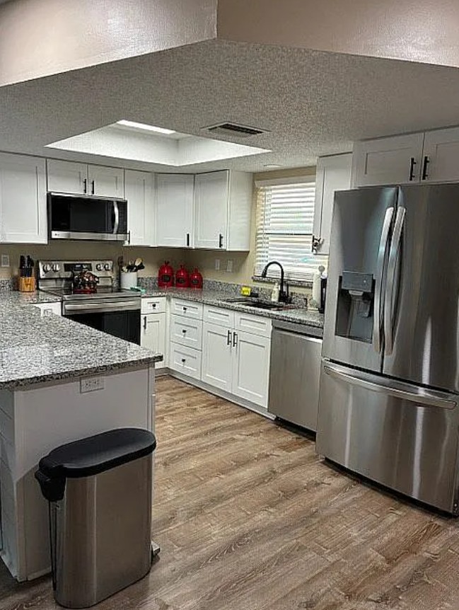 The updated kitchen showcases granite countertops, stainless steel appliances, modern cabinetry, and updated fixtures.