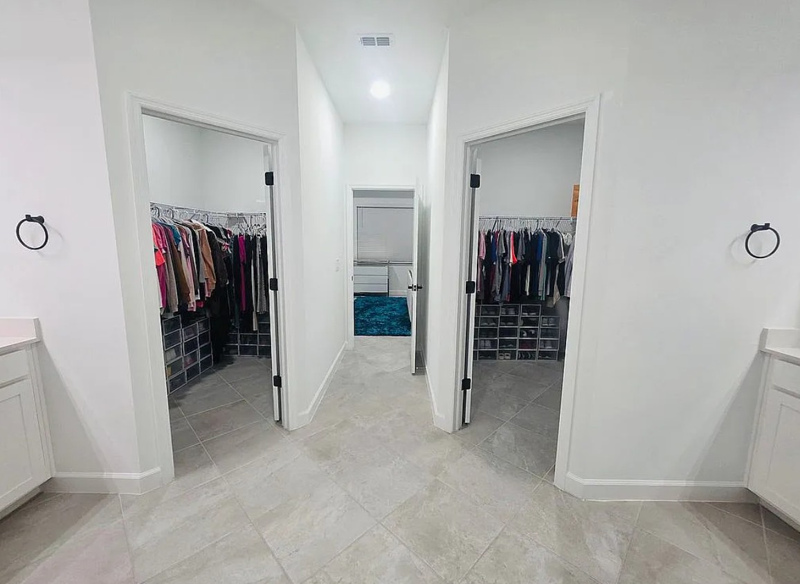 Tile flooring runs throughout the home, while the primary suite includes dual walk-in closets, a large walk-in shower, and dual vanities.