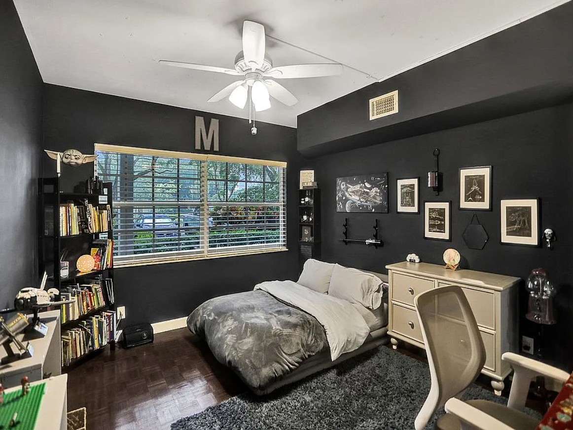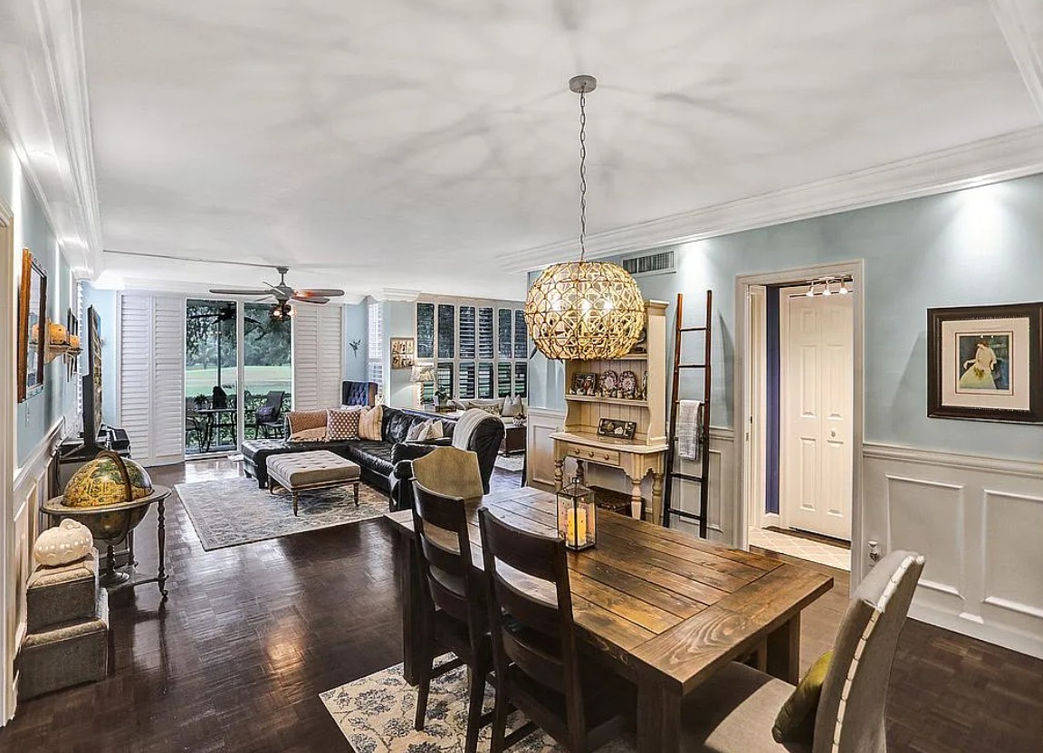 Real hardwood floors throughout, plantation shutters, crown molding, and recessed lighting add to the home’s upscale appeal.