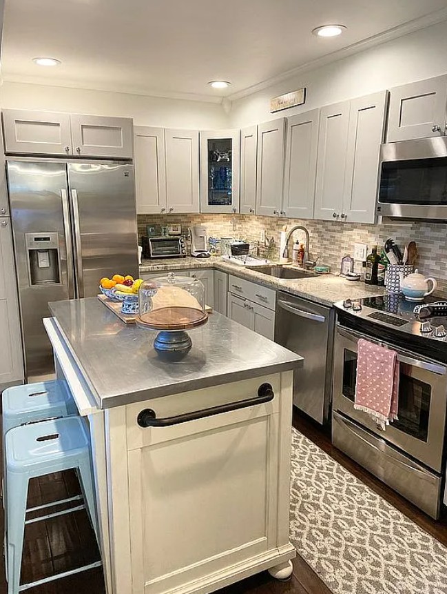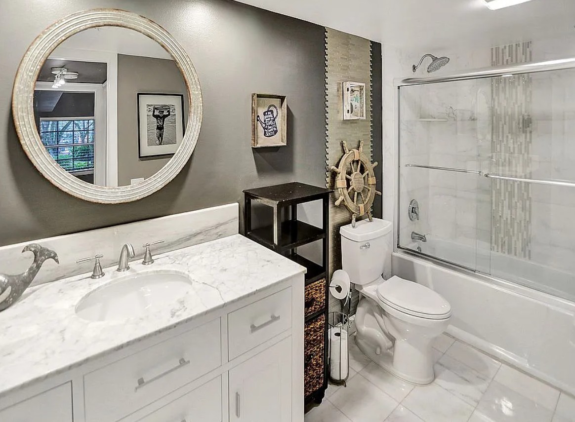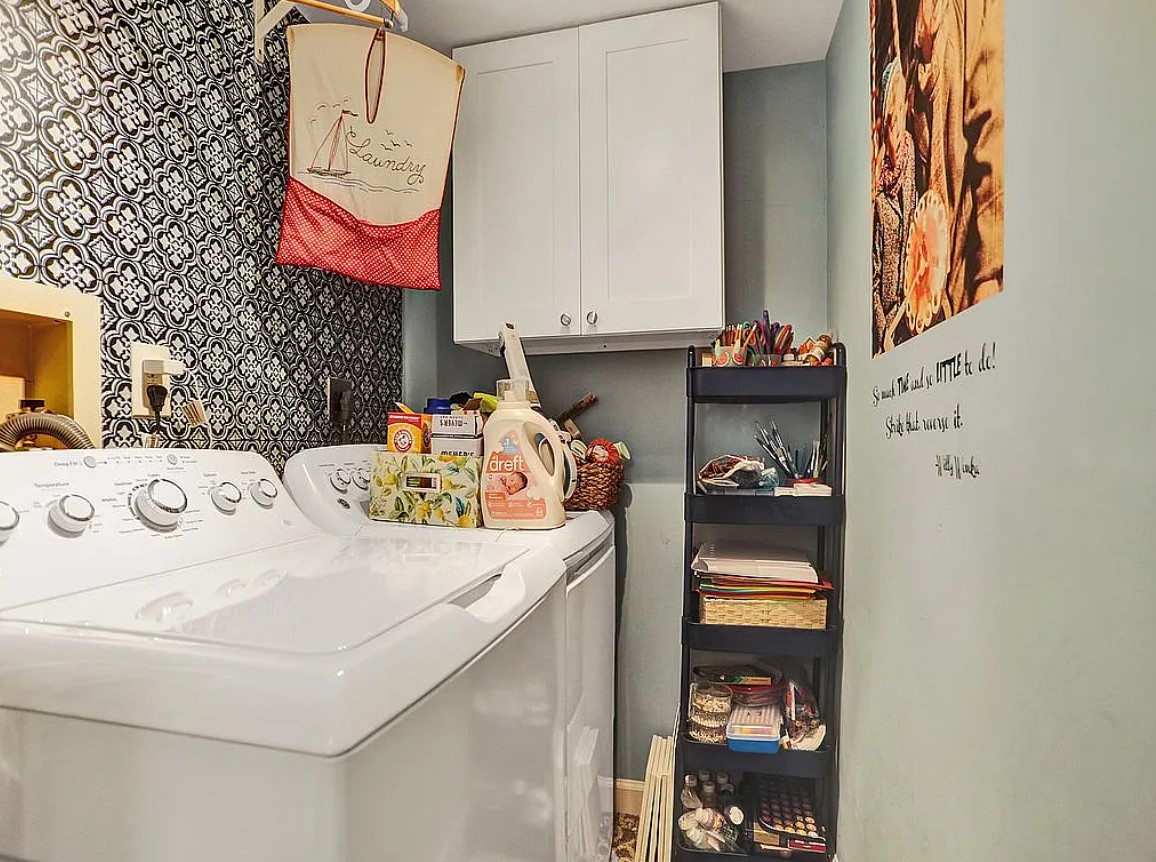The former half bath has been transformed into a large laundry room, with the option to convert it back if desired.