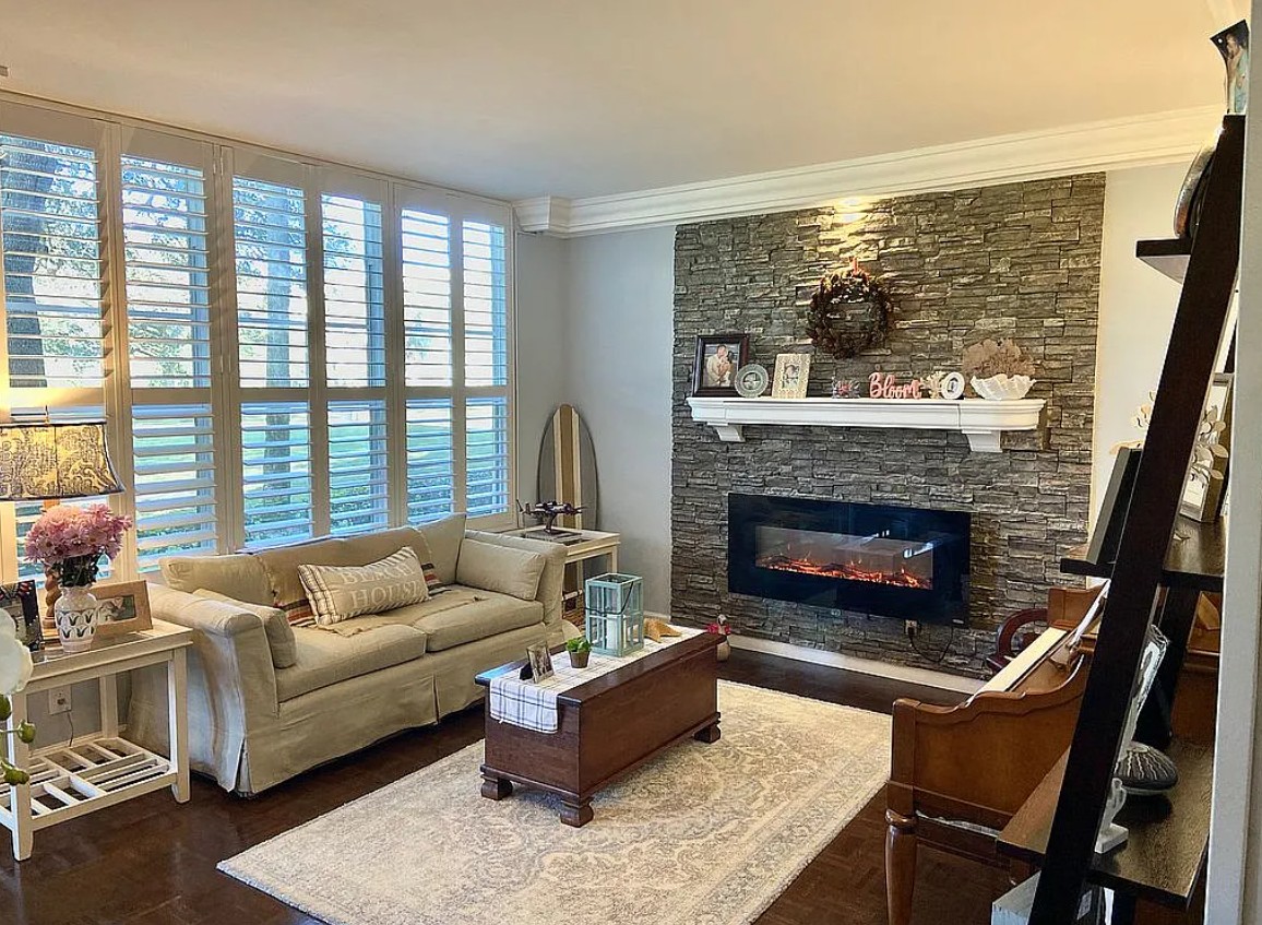 The third bedroom has been converted into an additional living space with an electric fireplace, but can easily be converted back to a bedroom.