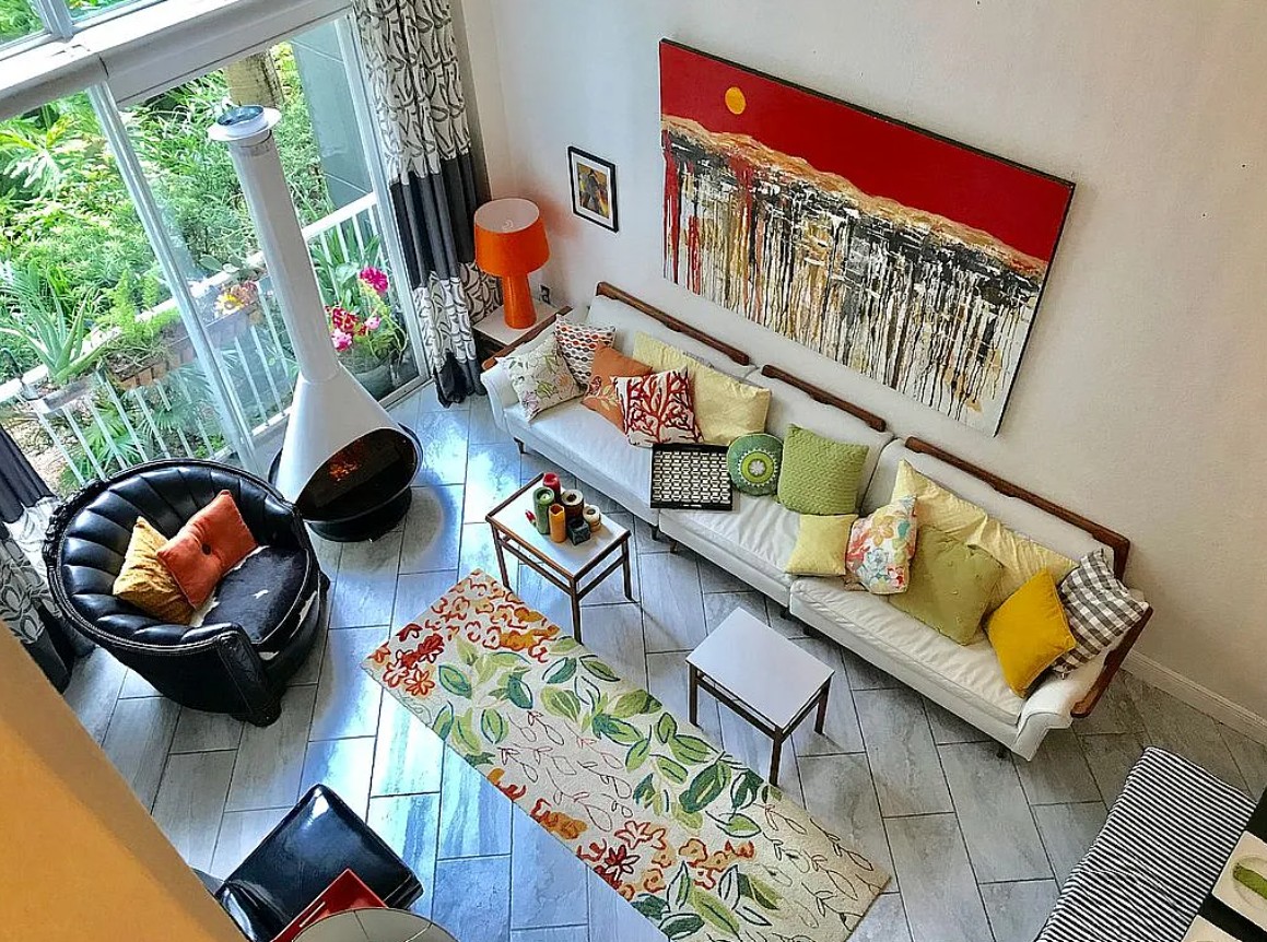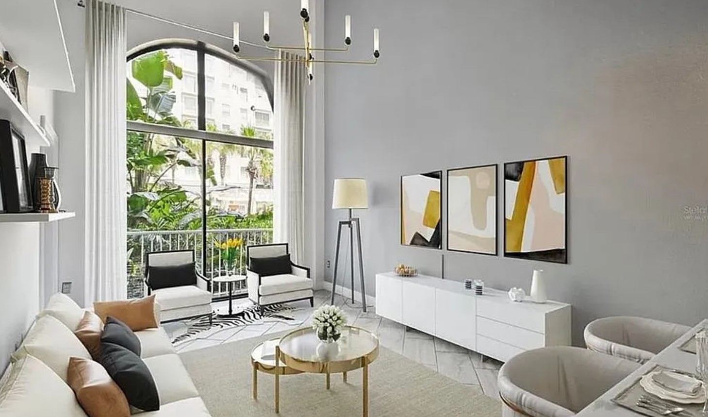 The dramatic ceiling height and open layout create a bright, spacious atmosphere that feels both modern and inviting.