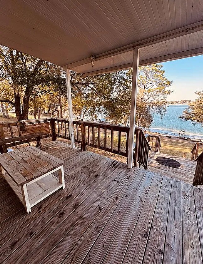 Step outside to a covered lakeside porch, perfect for morning coffee or sunset evenings overlooking the water.