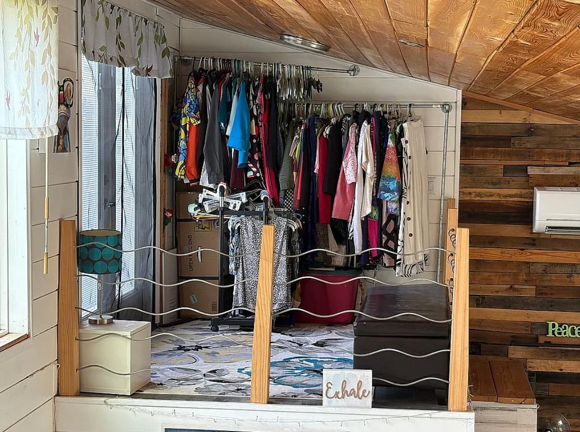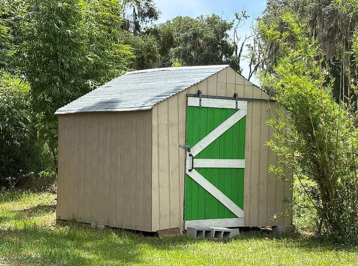 The property includes a floating boat dock, two boardwalks along the water, two fire rings, a barn, and four storage sheds, providing ample space for boats, gear, and hobbies.