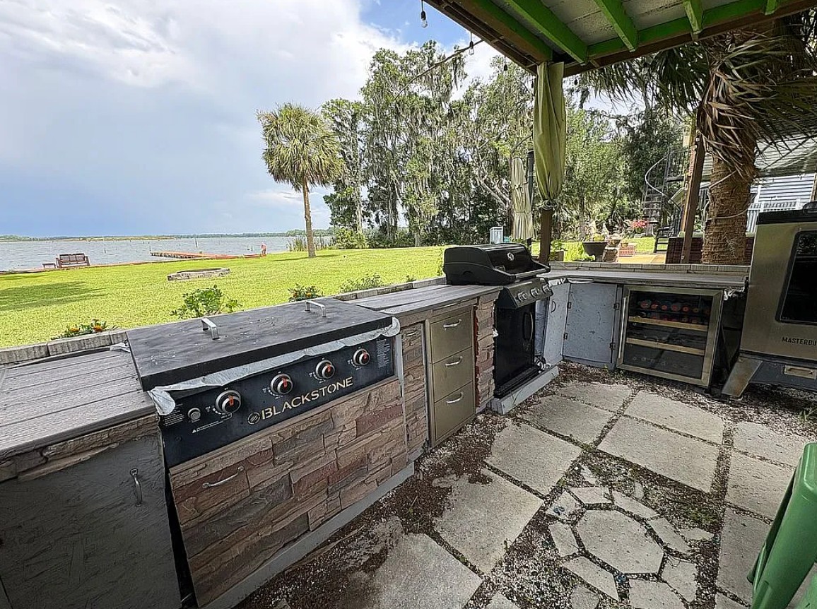 The outdoor living space is ideal for entertaining, with a fully equipped outdoor kitchen that includes a smoker, grill, oversized griddle, and refrigerator.