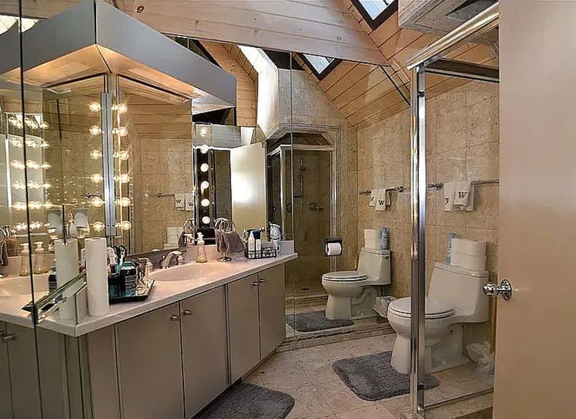 The upper-level primary bedroom suite is generously sized and includes a whirlpool tub, private exercise room, stunning marble bathroom with a large shower stall and skylight, and a walk-in closet.