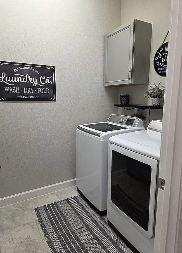 Dedicated laundry room with washer, dryer, and cabinets