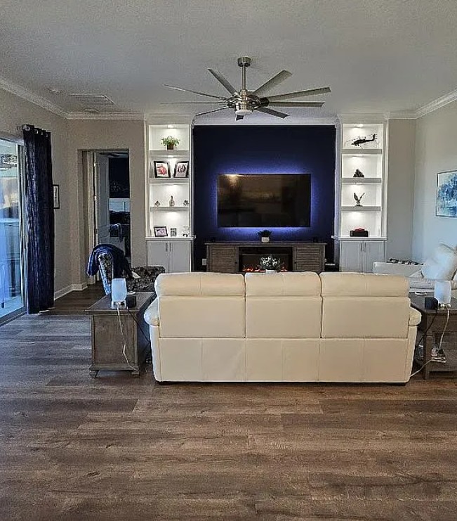 Family room with built-in lighted cabinets and crown molding